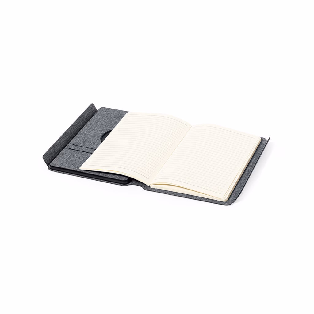 Cartellina/raccoglitore multifunzionale con chiusura magnetica - realizzata in poliestere 300D RPET, ricavato da plastica riciclata (etichetta RPET all'interno) - include caricatore wireless multiposizione da 10W integrato nella copertina, con attacco magnetico per poter utilizzare il dispositivo durante la ricarica e anello adesivo incluso, valido per tutti i dispositivi con tecnologia Magsafe e Qi - power bank integrato con capacità di carica di 5.000 mAh, con porta di ingresso/uscita Type-C e indicatori di stato di carica a LED, cavo incluso - interno con supporto per smartphone e numerosi scomparti per carte e portapenne - blocco A5 da 64 fogli a righe - presentata in un'attraente scatola dal design personalizzato - conforme alla normativa CE e prodotto secondo gli standard RoHS - dimensioni LxPxH cm 18x22,5x3