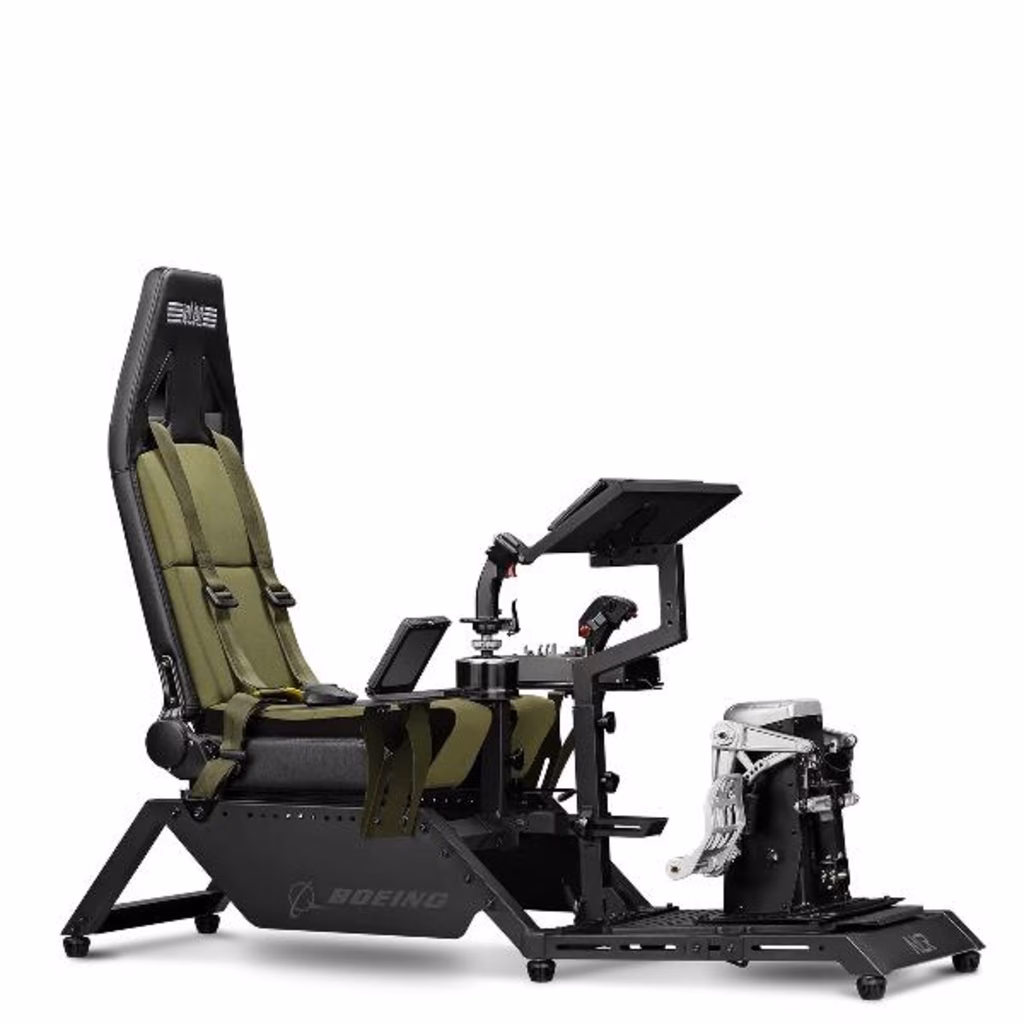 Next Level Racing® Flight Simulator Boeing Military Edition consente alla comunità Boeing di interagire con il marchio che ama e con la sempre più numerosa comunità della simulazione di volo. Il sedile è rivestito in tessuto di tela verde di ispirazione militare per assomigliare a una cabina di pilotaggio militare Boeing e offrire un esperienza di volo confortevole durante il combattimento. Per un esperienza visiva del marchio, il logo Boeing è ricamato sul retro del sedile di volo, inciso al laser sui pannelli laterali e sono stati aggiunti riflessi verde militare. Infine, Next Level Racing® ha collaborato con Thrustmaster® per garantire la compatibilità con Thrustmaster® TCA Yoke Pack Boeing Edition, per un esperienza di volo militare ispirata a Boeing. Con i cockpit Boeing Edition, gli utenti possono sperimentare le diverse categorie dell aviazione: Commerciale, Militare, Generale e Spaziale.