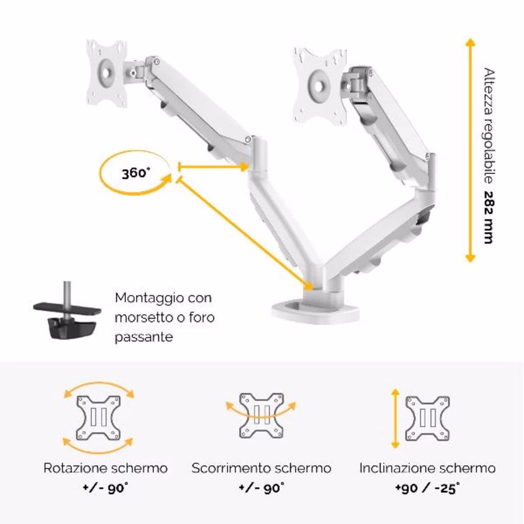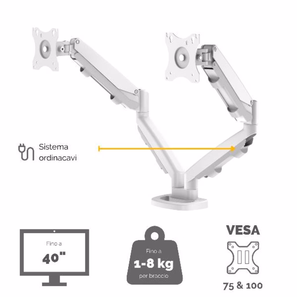 EPPA DOPPIO:Braccio monitor doppio completamente regolabile con innovativa tecnologia a molle a gas per spostamenti e regolazioni del monitor senza sforzi. Il sistema ordinacavi tiene la scrivania in ordine. Ciascun braccio sorregge fino a 8 kg e monitor fino a 39 . Rotazione 360°, scorrimento +/-180° e Inclinazione +/- 90°. Si estende fino a 53 cm e si regola in altezza fino a 26 cm. Facile montaggio a morsa (spessore tra 10 e 85 mm) o tramite foro (diametro tra 8 e 82 mm). Compatibilità VESA - 75 x 75 / 100 x 100.
