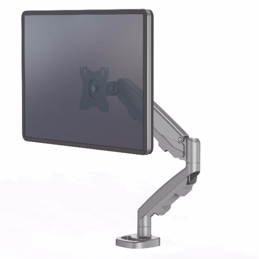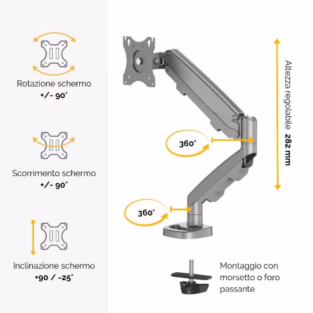 Braccio monitor completamente regolabile con innovativa tecnologia a molle a gas per spostamenti e regolazioni del monitor senza sforzi. Il sistema ordinacavi tiene la scrivania in ordine. Sorregge fino a 8 kg e monitor fino a 39 . Rotazione 360°, Scorrimento +/-180° e Inclinazione +/- 90°. Si estende fino a 53 cm e si regola in altezza fino a 26 cm. Facile montaggio a morsa (spessore tra 10 e 85 mm) o tramite foro (diametro tra 8 e 82 mm). Compatibilità VESA - 75 x 75 / 100 x 100.
