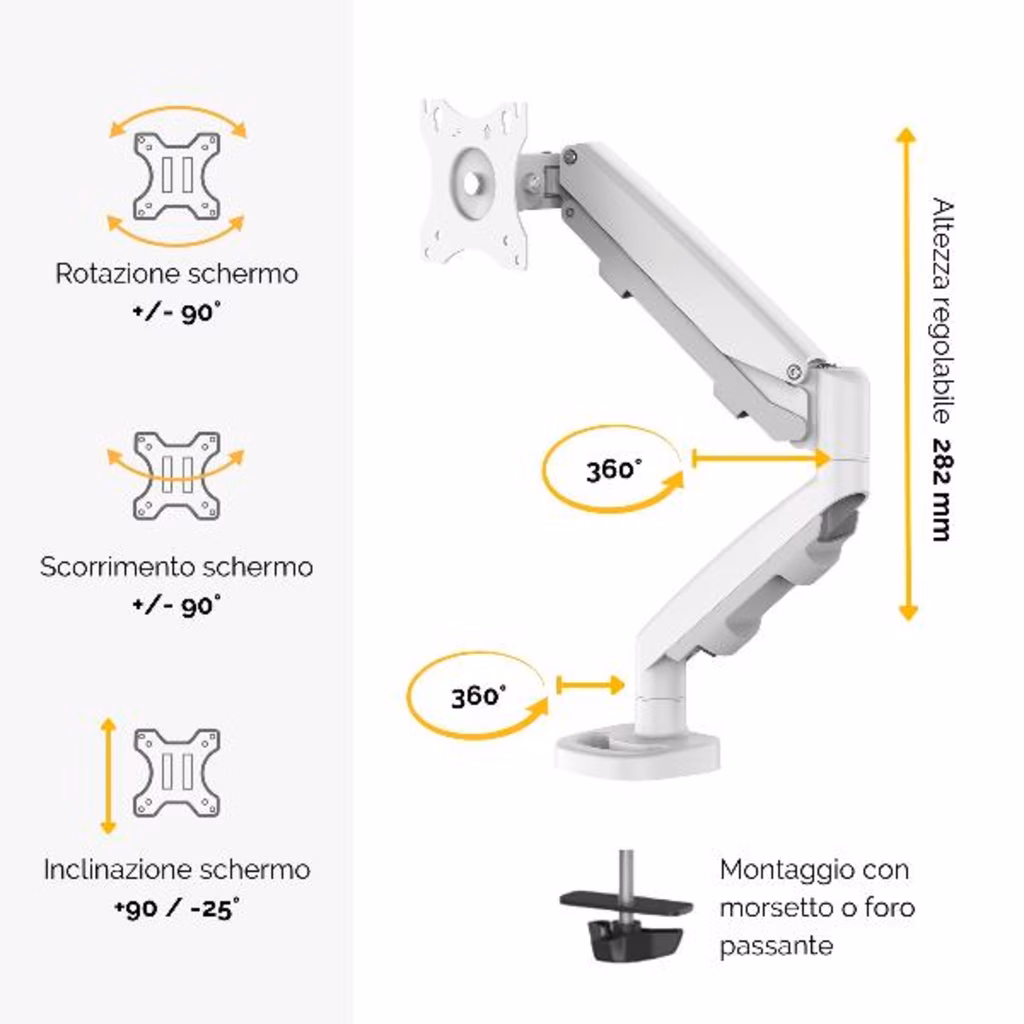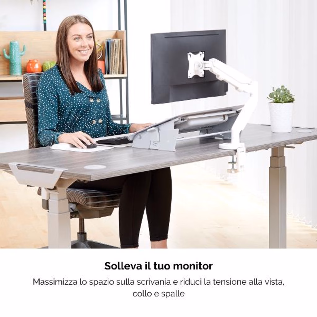 EPPA SINGOLO:Braccio monitor completamente regolabile con innovativa tecnologia a molle a gas per spostamenti e regolazioni del monitor senza sforzi. Il sistema ordinacavi tiene la scrivania in ordine. Sorregge fino a 8 kg e monitor fino a 39 . Rotazione 360°, Scorrimento +/-180° e Inclinazione +/- 90°. Si estende fino a 53 cm e si regola in altezza fino a 26 cm. Facile montaggio a morsa (spessore tra 10 e 85 mm) o tramite foro (diametro tra 8 e 82 mm). Compatibilità VESA - 75 x 75 / 100 x 100.