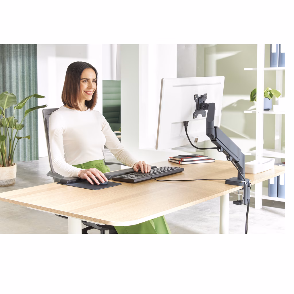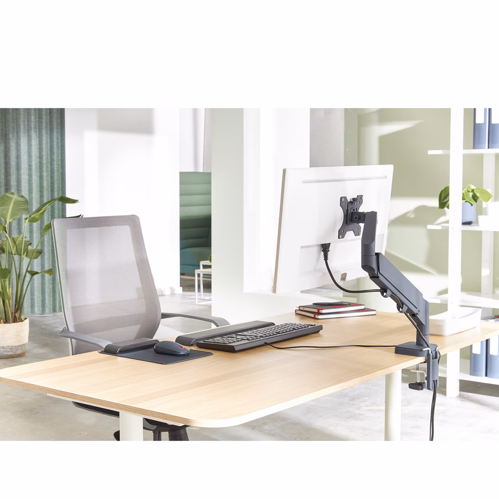 Per il montaggio di un monitor. Regola facilmente il monitor all'altezza ideale. Ha un impatto positivo sulla postura, favorisce il comfort di collo e spalle e aumenta la produttività se posizionato correttamente come consigliato. Il design salvaspazio è ideale per gli spazi di lavoro ridotti. Libera spazio prezioso sulla scrivania.
