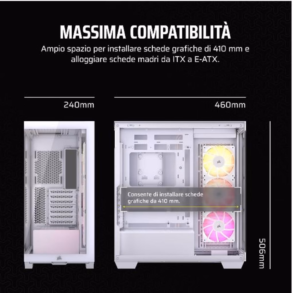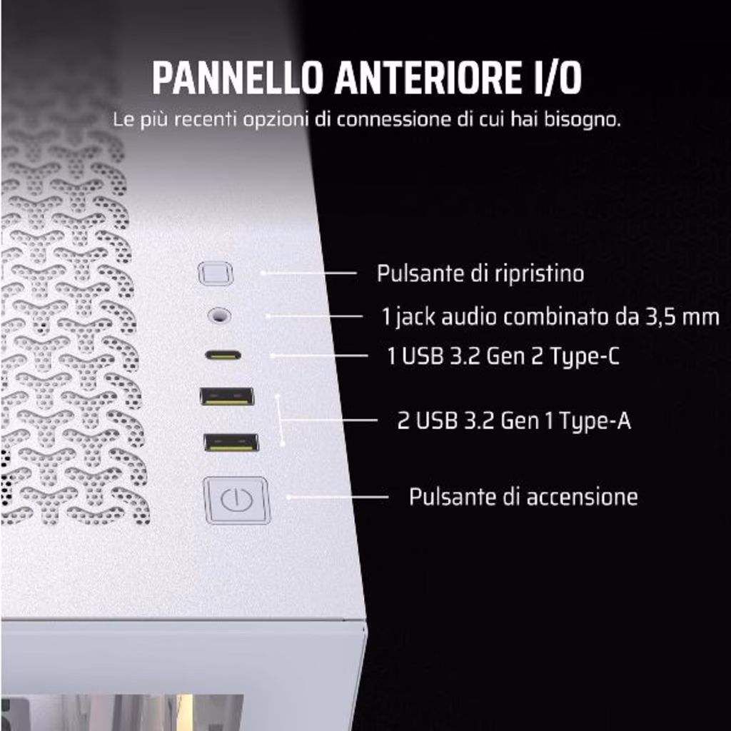 ·         Visuale panoramica con pannelli anteriori e laterali in vetro removibili·         3 ventole RS120 ARGB preinstallate·         Le caratteristiche più amate dagli appassionati di assemblaggio per un PC personalizzato ad alte prestazioni·         Punti di montaggio per ventole laterali, superiori ed in prossimità dell alimentatore per straordinarie prestazioni di raffreddamento·         Compatibile con schede madri con connettore inverso tra cui ASUS BTF, MSI PROJECT ZERO e GIGABYTE PROJECT STEALTH