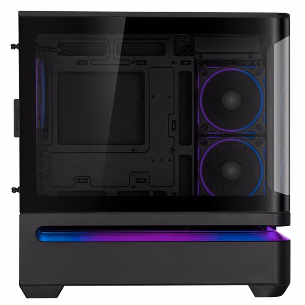 Supporta GPU fino a 420 mm di lunghezza?Il pannello in vetro temperato curvo si estende senza soluzione di continuità dalla parte anteriore a quella laterale, offrendo una vista panoramica dei componenti da quasi tutte le angolazioni