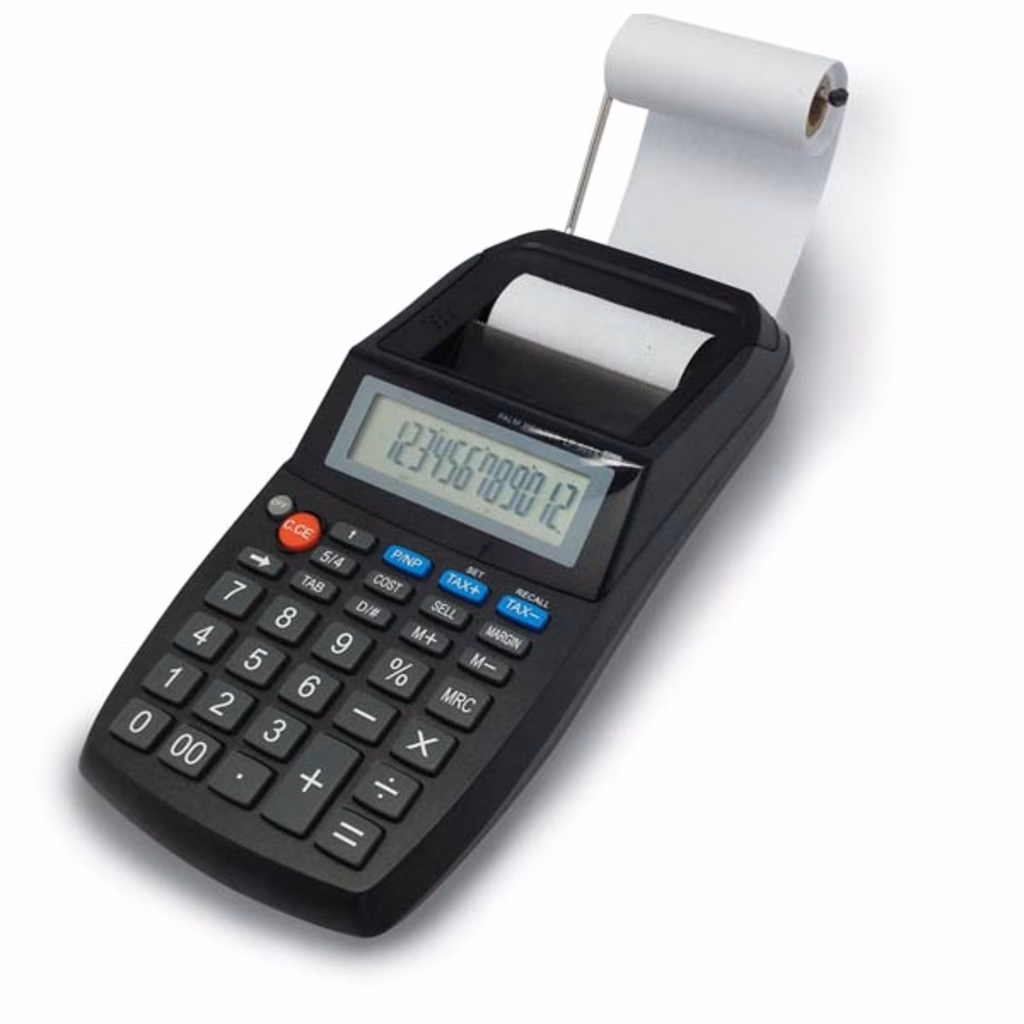 Calcolatrice scrivente dalle ridotte dimensioni - display a 12 cifre, utilizza carta standard da mm 57/58 - dotata di tasto euroconveritore - alimentazione a 4 batterie tipo AA (incluse) o alimentatore di rete (opzionale)