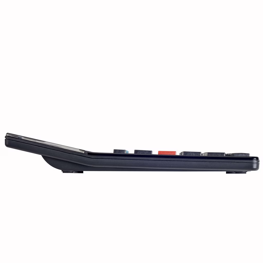 Calcolatrice da tavolo professionale. Grande display a 2 righe; visualizzazione della procedura di calcolo. Ergonomica: grande display inclinato; a risparmio energetico: ad energia solare e a batteria; spegnimento automatico. Display LCD a 12 cifre a 2 righe. Calcolo delle imposte: tasti TAX+/TAX-; tasto percentuale; calcolo del margine di guadagno; funzione sell/cost/margin: calcolo del prezzo di vendita; di acquisto o del margine; tasto backspace: cancella l'ultima cifra digitata; spegnimento automatico; garanzia: 5 anni. Batteria ausiliaria LR1130 in dotazione.