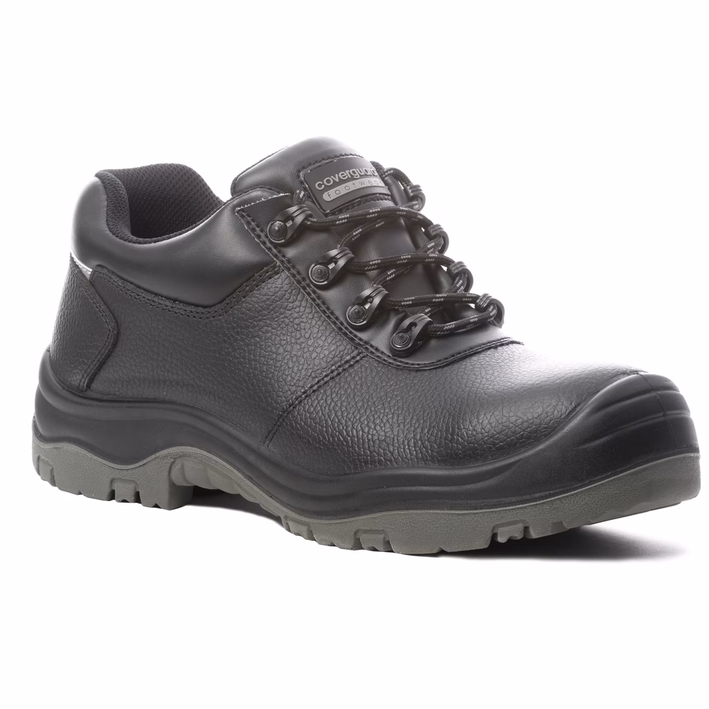 Calzatura di sicurezza bassa in pelle pieno fiore nera idrorepellente con fodera traspirante in tessuto, puntale in composito, suola intermedia e suola esterna in PU, suola antiperforazione in tessuto, rinforzo anteriore in PU, inserto rifrangente posteriore per maggiore visibilità, imbottitura per miglior calzabilità e rinforzo antitorsione della volta plantare, progettata per garantire protezione, comfort e durata in diversi ambienti di lavoro.
