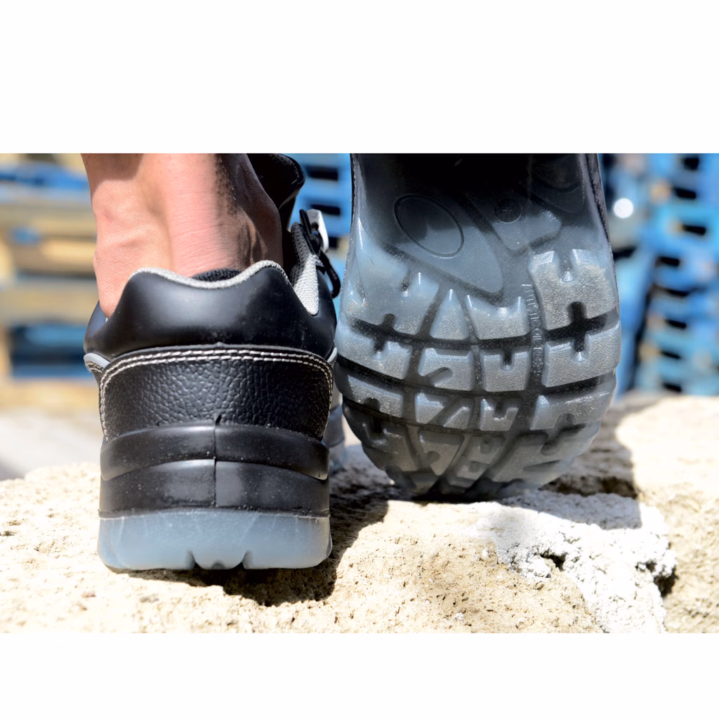 Calzatura bassa S3 SRC metal free - tomaia in pelle crosta - dotata di meccanismo per lo sfilamento rapido - lamina antiforo puntale in composito - soletta ergonomica - suola bidensità PU/TPU con proprietà antistatiche, antiscivolo e antiolio