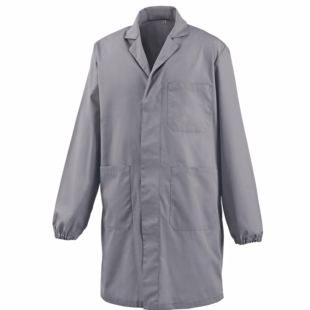 Camice da lavoro con bottoni a pressione coperti tre tasche anteriori elastico ai polsi. Composizione tessuto: 65% poliestere - 35% cotone