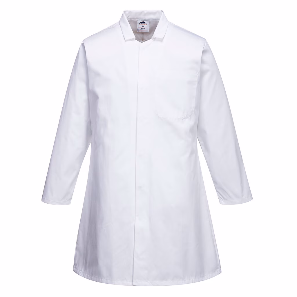 Camice per lindustria alimentare con una tasca interna per riporlo. Realizzato con il nostro resistente policotone Kingsmill. - Tessuto twill durevole che non sbiadisce con i lavaggi - Non si restringe e mantiene la sua forma lavaggio dopo lavaggio - Facile apertura frontale con bottoni - Tasca interna sul petto - 1 tasca sicura - Lavabile in lavatrice a 60 ° C