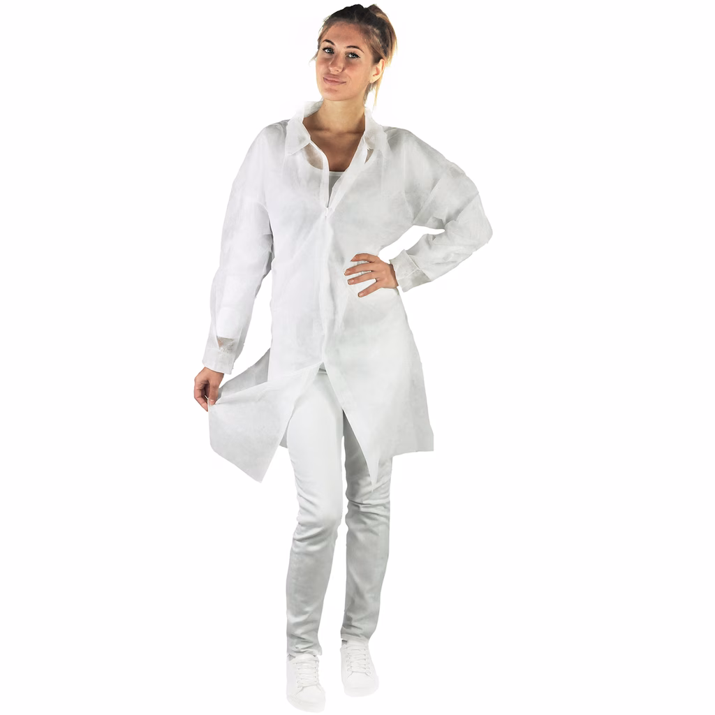 Camice monouso da laboratorio in TNT di polipropilene PP, traspirante e resistente, idrorepellente, non sterile - manica lunga e colletto - elastico ai polsi - tasca interna - chiusura con bottoni a clip