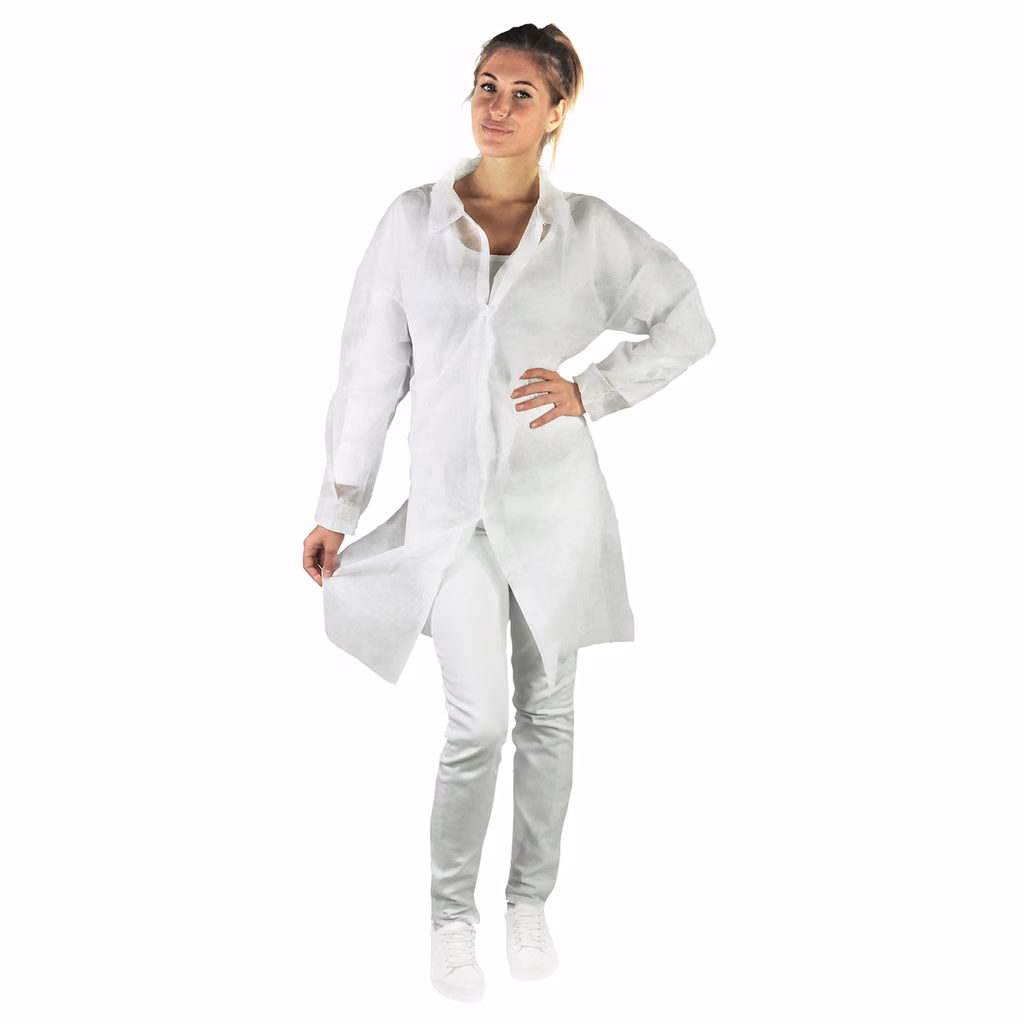 Camice monouso da laboratoRIO in TNT di polipropilene PP, traspirante e resistente, idrorepellente, non sterile - manica lunga e colletto - elastico ai polsi - tasca interna - chiusura con velcro