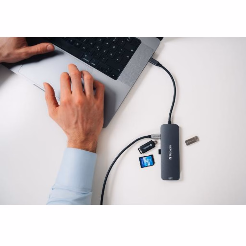 Portati dietro l'intera scrivaniaL'hub multiporta USB-C® Pro 8 porte di Verbatim è caratterizzato da otto porte versatili collegate tramite un'unica connessione USB-C. La doppia uscita HDMI consente la connessione a più monitor per un'area di lavoro più ampia, al contempo le tre porte USB-A possono essere utilizzate per molti altri dispositivi essenziali da scrivania. Serve anche un lettore di schede? Questo hub propone inoltre slot per schede di memoria SD e microSD e una pratica porta USB-C PD per un caricamento pass-through ininterrotto.Doppia risoluzione fino 8K Ultra HDLe due porte HDMI dell'hub multiporta Pro ti consentono di allargare il video su due televisori o monitor compatibili. Supporta risoluzioni Ultra HD 4K nitidissime, offrendo contenuti ricchissimi di funzionalità per un'esperienza immersiva di ultima generazione per una visione ancora più definita, l'HDMI 1 supporta una risoluzione fino a 8K. Anche a frame rate più elevati, l'hub garantisce comunque una visione fluida e continua senza alcuna limitazione o ritardo.