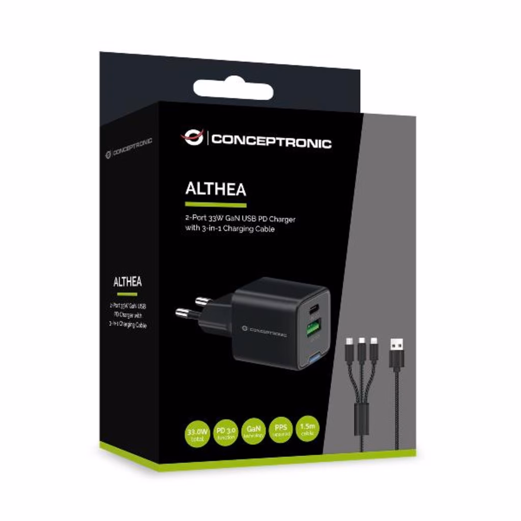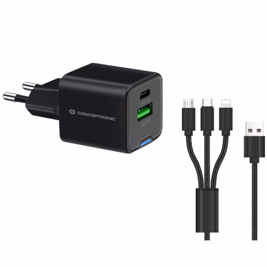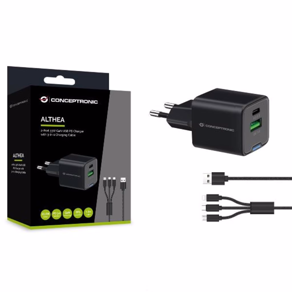 Caricabatterie a 2 porte PD (1x USB e 1x USB-C) con cavo CONCEPTRONIC ALTHEA16B 33W colore nero