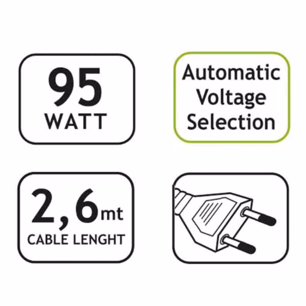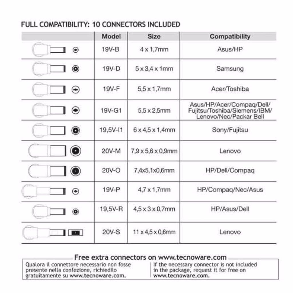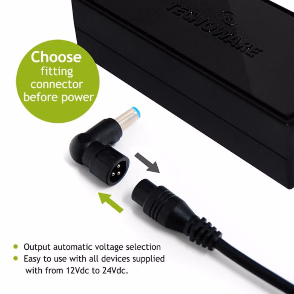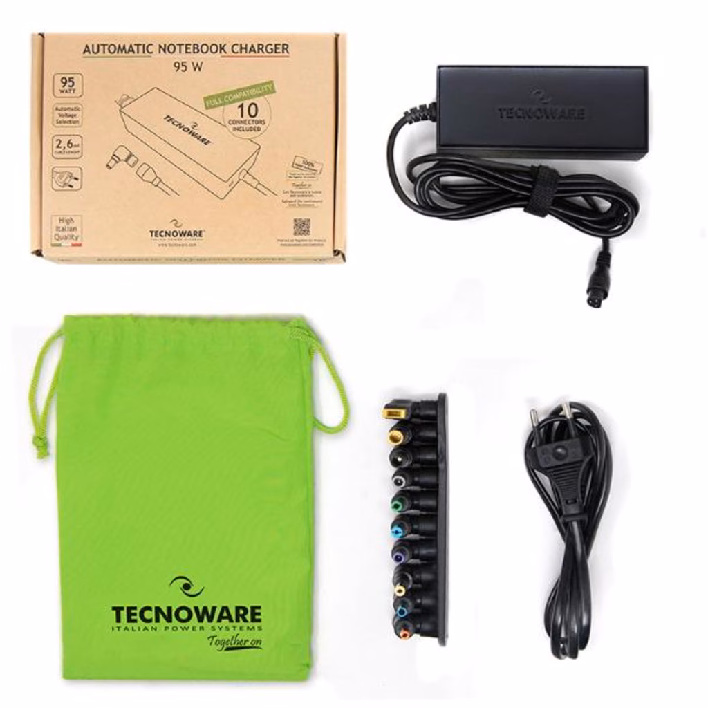 Alimentatore Universale AUTOMATICO 95W TOGETHERON per casa/ufficio 230Vac 50/60Hz colore nero, compatibile con le principali marche e modelli di notebook, ultrabook, tablet; set di 10 connettori modulari incluso (Ulteriori connettori disponibili su www.tecnoware.com) , tensione d'uscita a selezione automatica in base al connettore utilizzato, protezione da sovraccarico e cortocircuito, controllo temperatura interna, lunghezza cavo d ingresso 100 cm, lunghezza cavo d'uscita 150 cm, dimensioni 11,2X4,4X2,7 cm