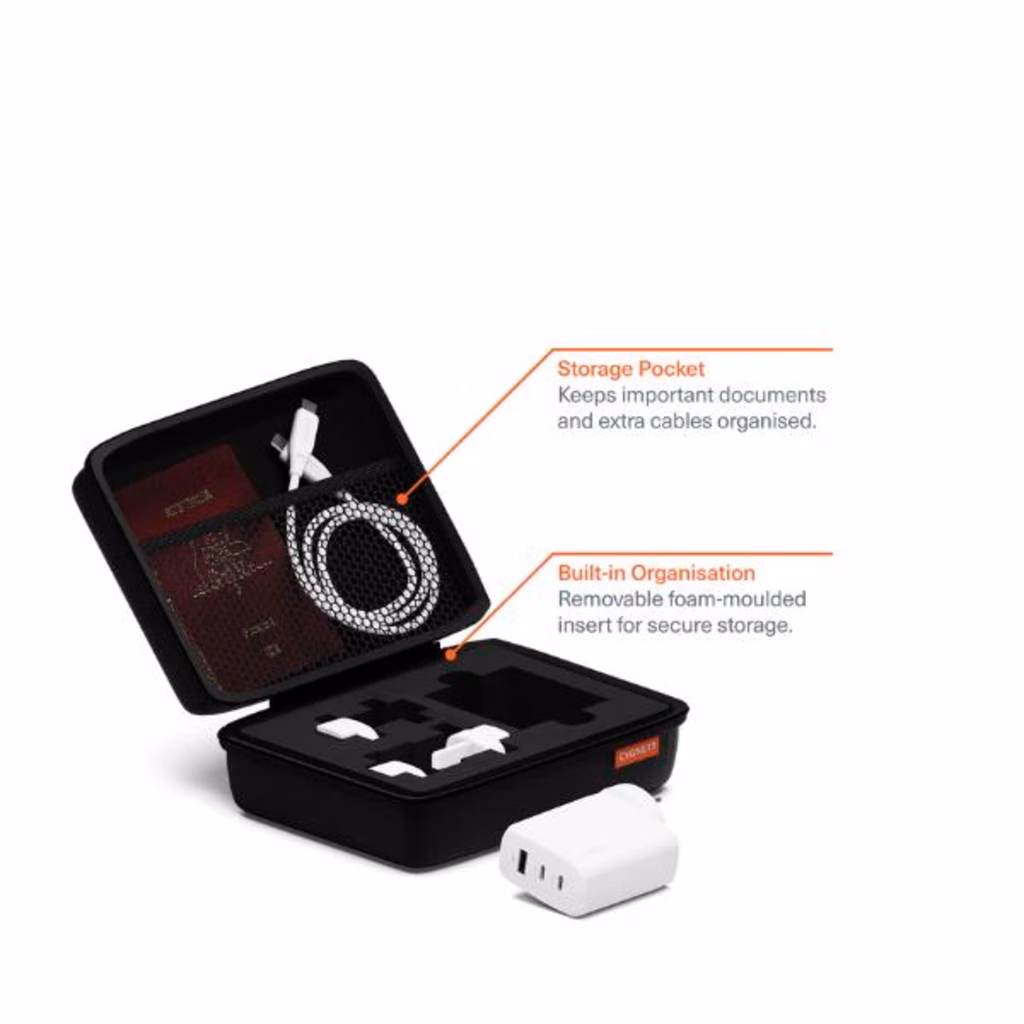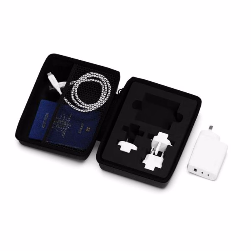 tu vada. Progettato con un meccanismo di interblocco in due fasi, dà priorità alla sicurezza per te e i tuoi cari mantenendo i tuoi dispositivi accesi in movimento. Carica fino a 3 dispositivi contemporaneamente e conserva il contenuto del tuo kit nella custodia da viaggio con cerniera, dotata di inserti in schiuma sagomata per mantenere tutto al sicuro e organizzato.