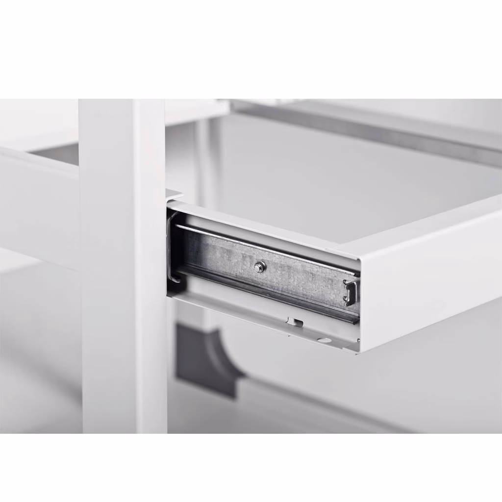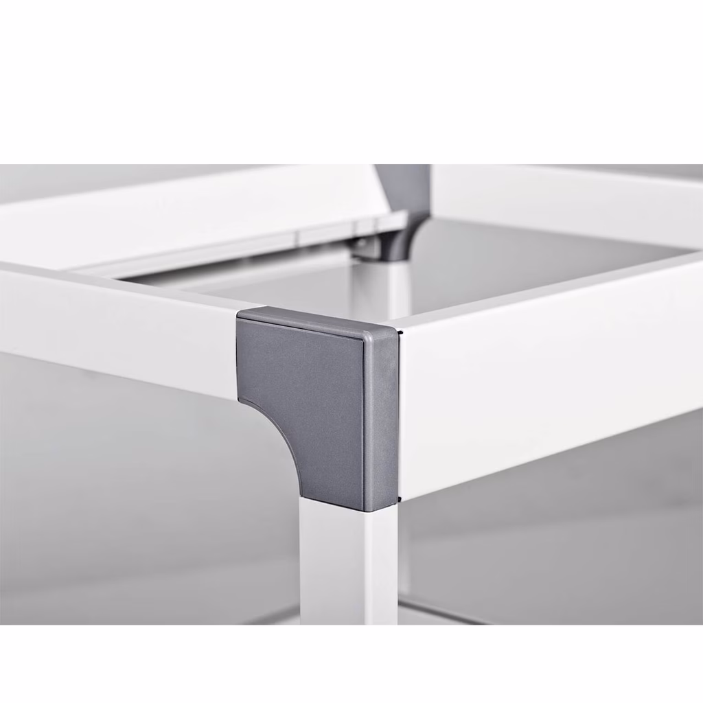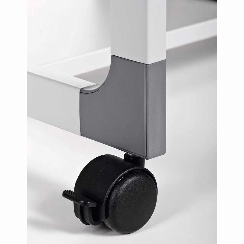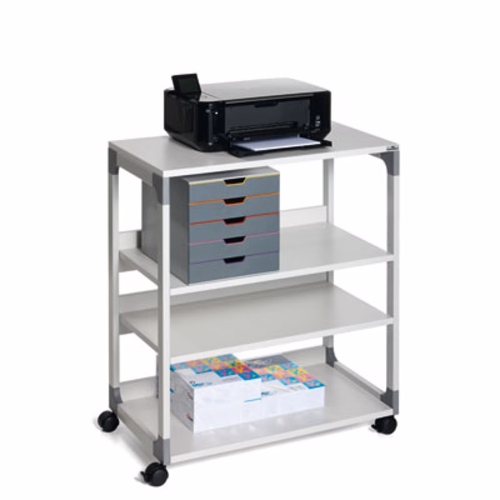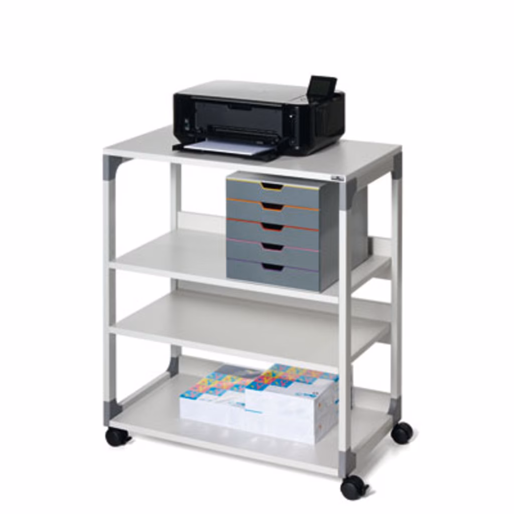 Mobile multifunzione flessibile per l'archiviazione di dispositivi elettrici e attrezzi di ufficio - Mobile e sicuro nel movimento (fornito di 4 ruote pivottanti, di cui 2 provviste di dispositivo di bloccaggio) - I quattro ripiani resistenti (19 mm di spessore), di cui due regolabili in altezza (32 mm di distanza) offrono ulteriore spazio di archiviazione - Archiviazione sicura di raccoglitori e carta grazie alle sponde trasversali antiribaltamento - Montaggio semplice grazie alle istruzioni di montaggio incluse - Struttura stabile in acciaio antigraffio con angoli in plastica rinforzata con fibre di vetro