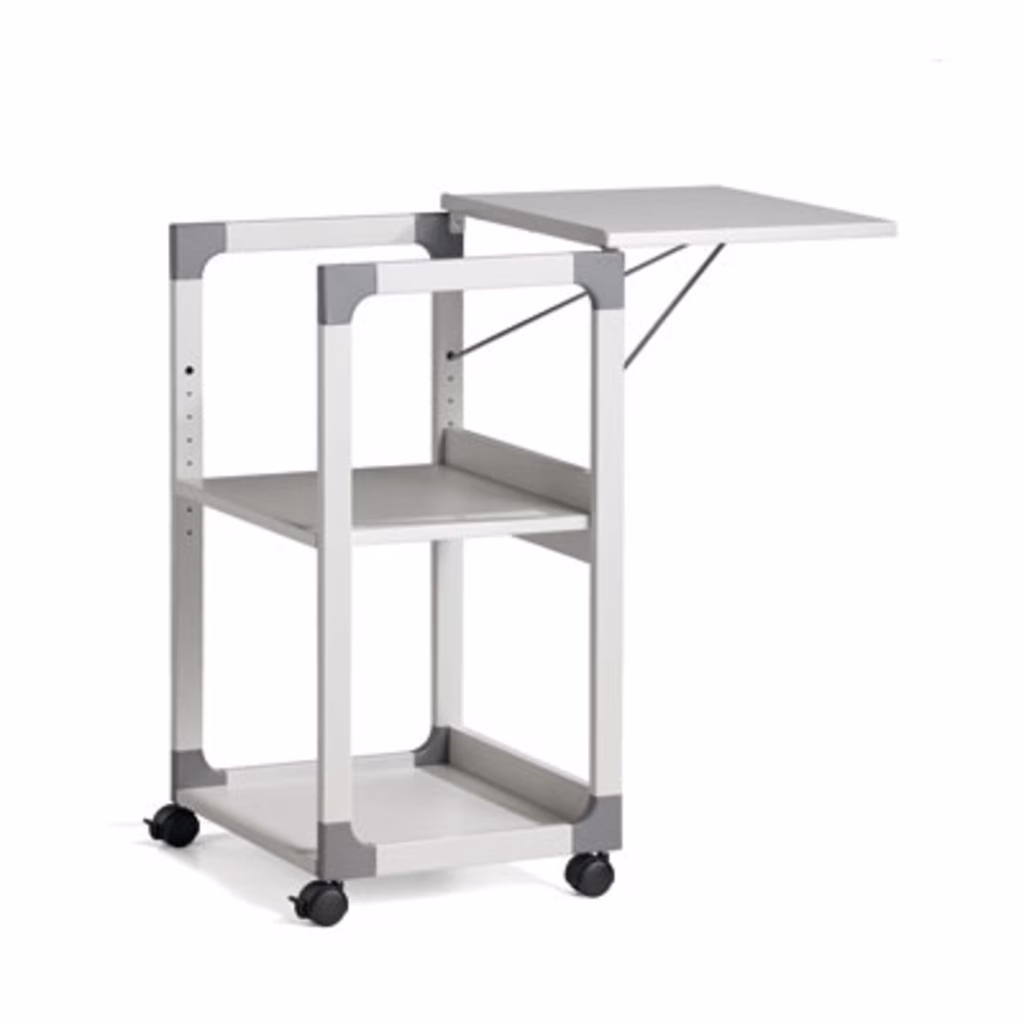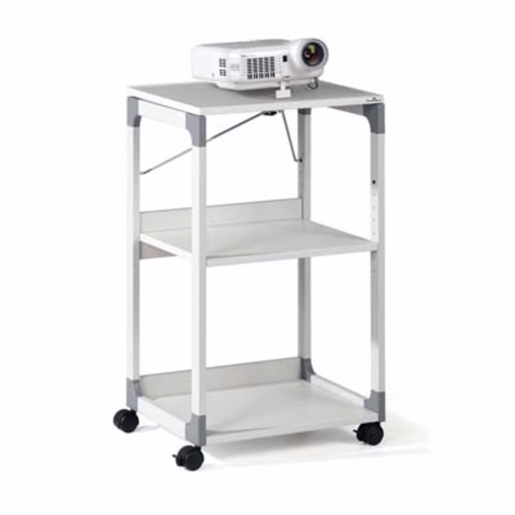 Carrello mobile per l'utilizzo di proiettori e videoproiettori - Utilizzo variabile grazie al ripiano centrale regolabile (32 mm di distanza) e adattamento del pannello superiore nell'angolo di inclinazione per videoproiettori e ruotabile a 180° per l'utilizzo di lavagne luminose - Flessibile grazie a 4 ruote pivottanti, di cui 2 provviste di dispositivo di bloccaggio - Resistente con pannelli robusti (19 mm) come ripiani - Montaggio semplice grazie alle istruzioni di montaggio incluse - Struttura stabile in acciaio antigraffio con angoli in plastica rinforzata con fibre di vetro