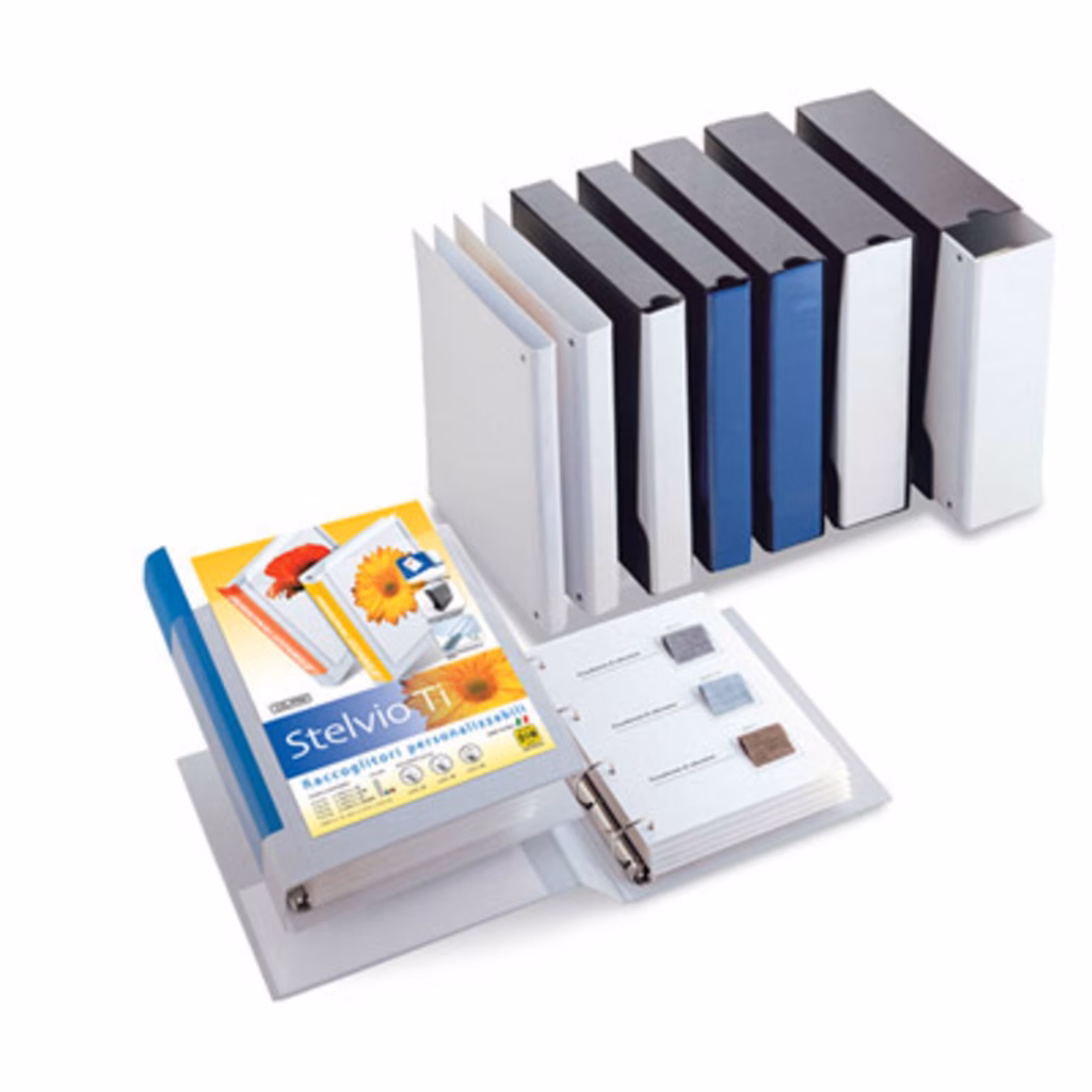 Cartella in Colpan, robusto materiale plastico antiurto - meccanismo metallico ad anelli - tasca interna trasparente - personalizzabile su copertina e dorso - ideale per presentazioni di progetti, ricerche, ecc.