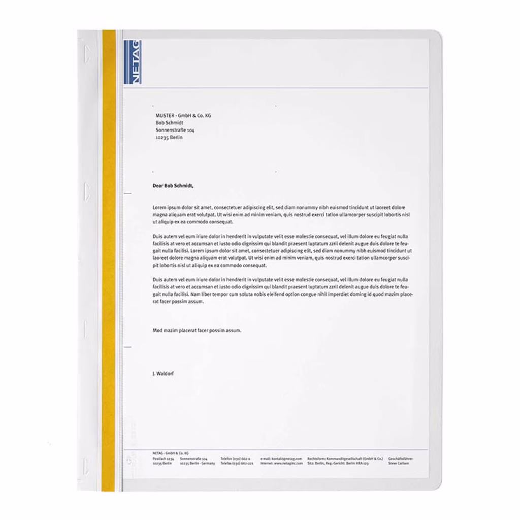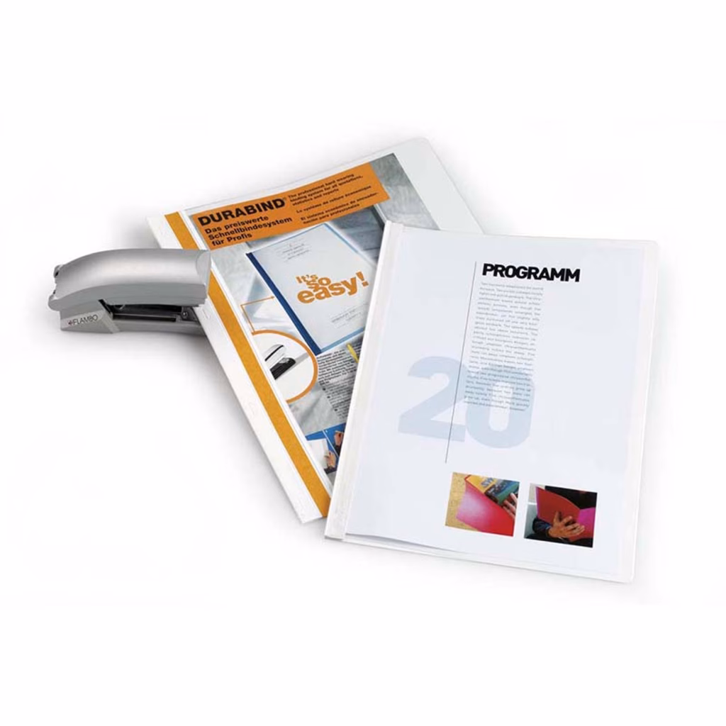 Sistema rapido e semplice per la rilegatura permanente di documenti e fascicoli, realizzata in materiale di alta qualità. La cartellina è dotata di copertina frontale trasparente e posteriore colorata: su quest'ultima vi sono occhielli a scomparsa per larchiviazione in registratori a leva e raccoglitori ad anelli (foratura: mm 70/80). Capacità: 1-30 fogli formato A4.