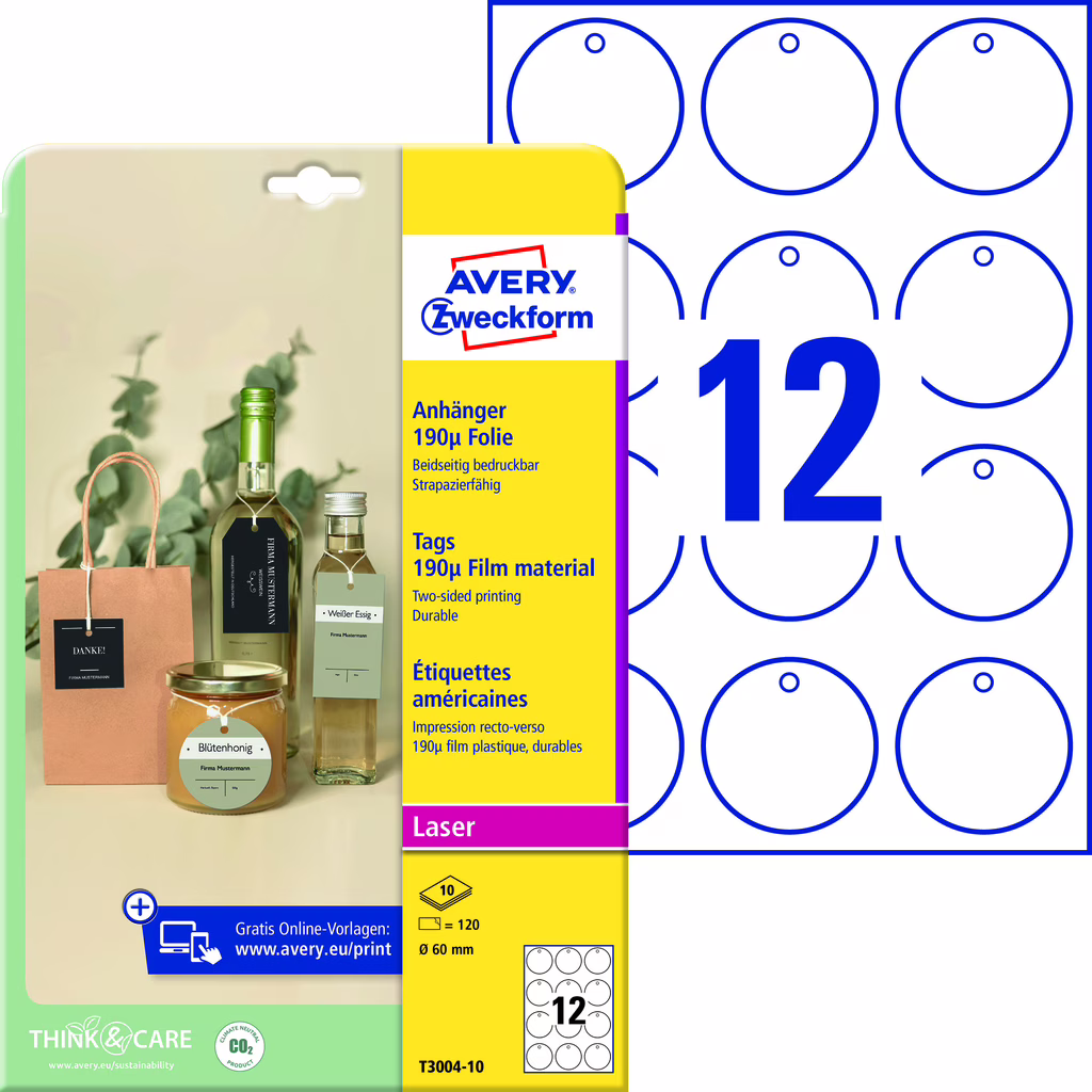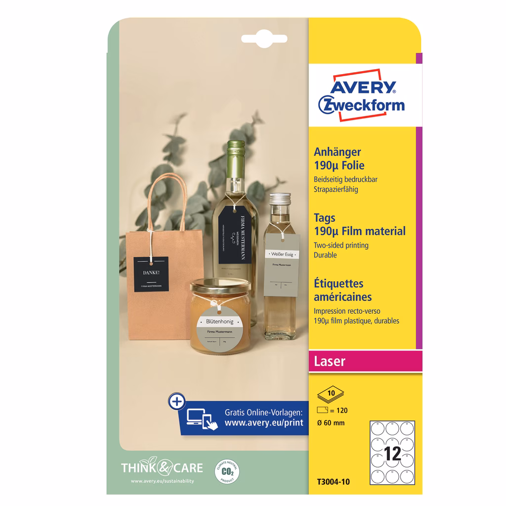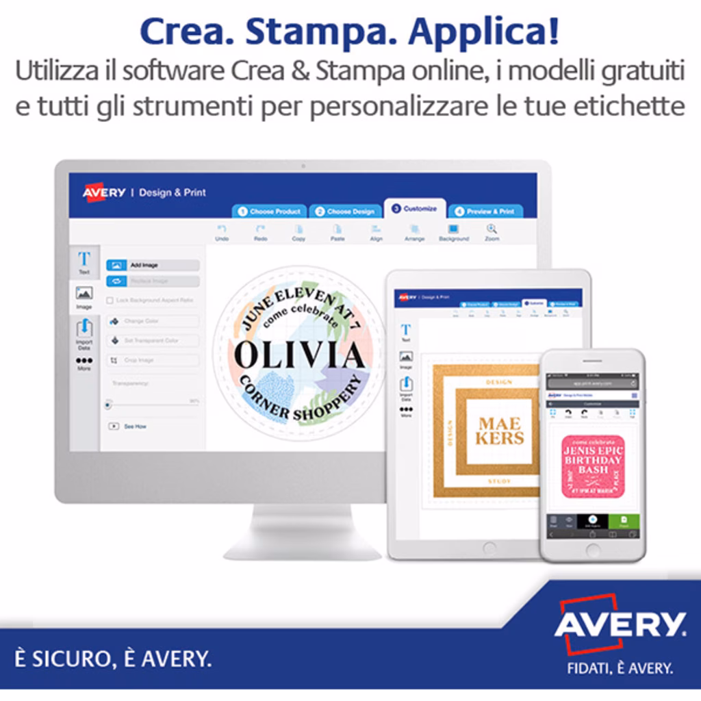 Catturano immediatamente l'attenzione e offrono lo spazio necessario per fornire tutte le informazioni utili. Perfetti per l'identificazione di cosmetici, bevande e alimenti e oggetti che vengono esposti all'esterno o che devono resistere a condizioni difficili. Realizzati in plastica da 190 ultraresistente. Sono impermeabili, resistenti agli strappi, agli agenti chimici e ai raggi UV. Ideali anche per uso esterno. Cordoncino incluso. Tecnologia Quick&Clean che consente di separarli facilmente dal foglio e ottenere bordi perfettamente lisci. Semplici e veloci da stampare grazie al programma gratuito Crea e Stampa Online di Avery