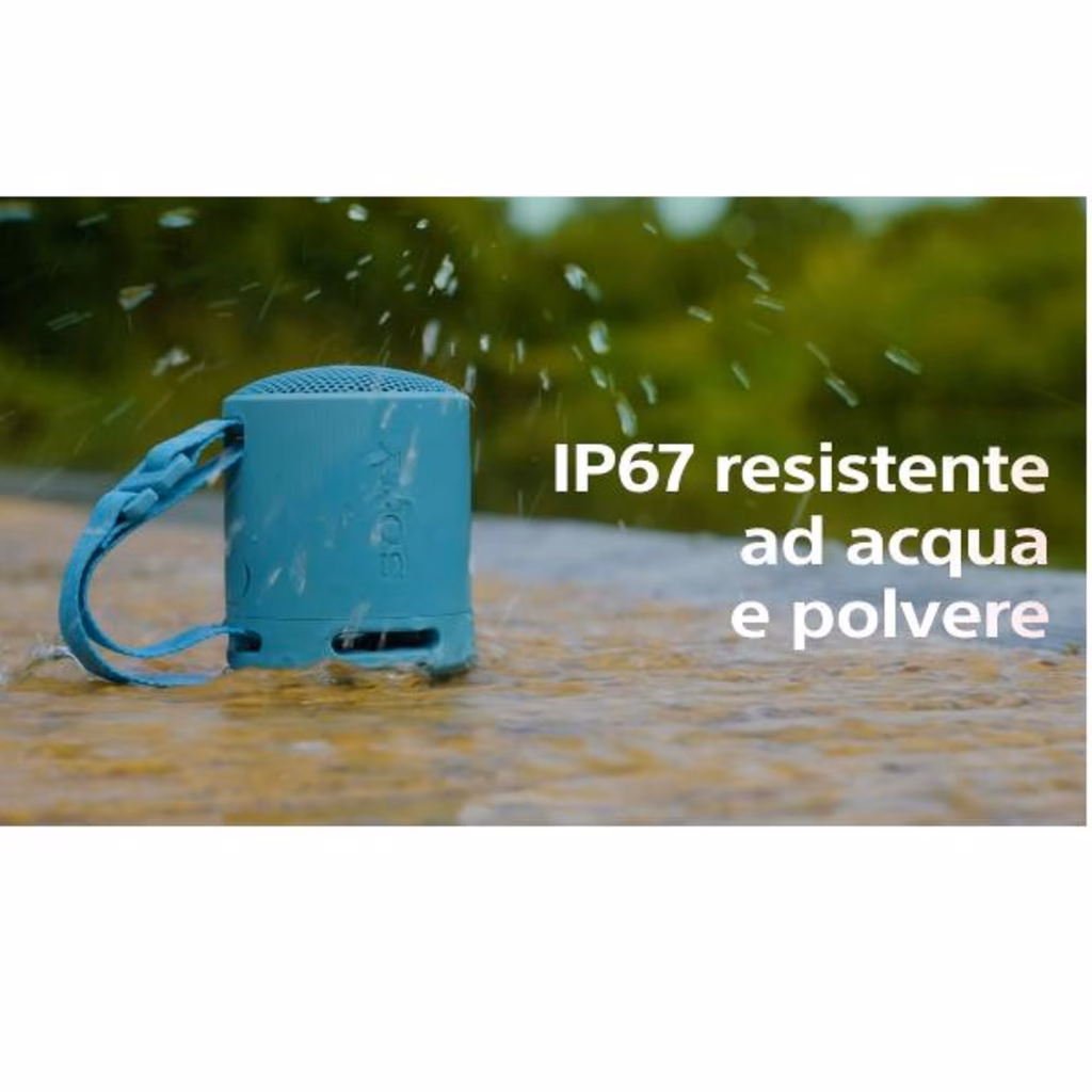 Audio che riempie lo spazioGrazie al processore per la diffusione del suono e al radiatore passivo integrato, l XB100 espande l audio in ogni direzione, garantendo bassi profondi e voci cristalline. Che tu sia in una stanza, all aperto o in movimento, la qualità del suono resta sempre impeccabile.Design pensato per l avventuraRealizzato per accompagnarti ovunque, lo speaker è ultracompatto, leggero e dotato di una comoda cinghia per il trasporto. La struttura resistente all acqua e alla polvere (certificazione IP67) lo rende il compagno ideale per spiagge, escursioni, picnic o semplicemente per rilassarti in giardino.Energia che dura tutto il giornoCon una batteria che offre fino a 16 ore di autonomia, puoi goderti la tua musica preferita senza interruzioni. E grazie alla porta USB-C, la ricarica è semplice e veloce.Connettività intelligenteVuoi un suono ancora più coinvolgente? Collega due SRS-XB100 in modalità stereo per un effetto audio immersivo. Inoltre, il microfono integrato con tecnologia di cancellazione dell eco garantisce chiamate chiare e senza disturbi.Sostenibilità firmata SonySony si impegna per un futuro più verde: l XB100 è realizzato con materiali riciclati e viene fornito in un imballaggio plastic-free, per un ascolto che rispetta l ambiente.