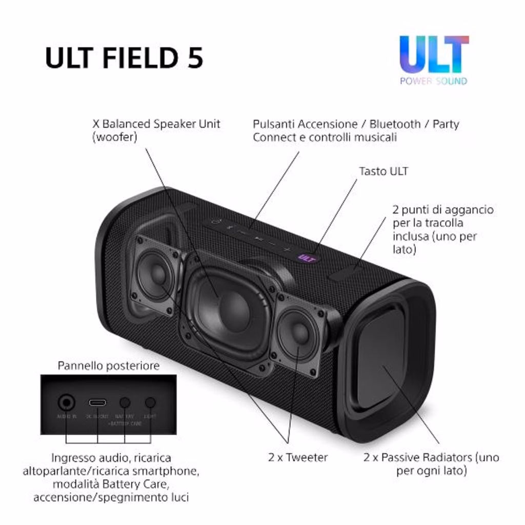 Grazie all'esperienza decennale di Sony nel campo dell'audio, l'ULT FIELD 5 offre un suono potente e pieno in un design portatile. Un woofer grande e potente si combina con due tweeter wide-range di alta qualità per produrre un audio impressionante con una potenza soddisfacente, mentre i due radiatori passivi su entrambi i lati migliorano i bassi, aggiungendo profondità a ogni ritmo. Personalizzate il vostro suono utilizzando l'equalizzatore a 10 bande e la selezione di preset nell'app Sony - Sound Connect.
