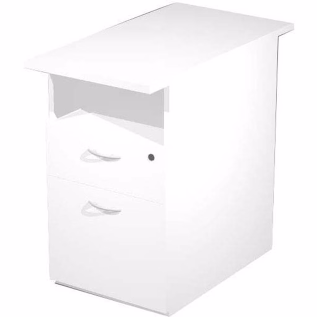 Cassettiere alte da affiancare alle scrivanie al lato di L80 cm nelle postazioni compact con sagomatura. Cassetti con guide metalliche e fermo a fine corsa. Modello da L43 P80 H72 cm con un vano a giorno, 1 cassetto con serratura e 1 cassetto classificatore per cartelle sospese interasse 33 cm.