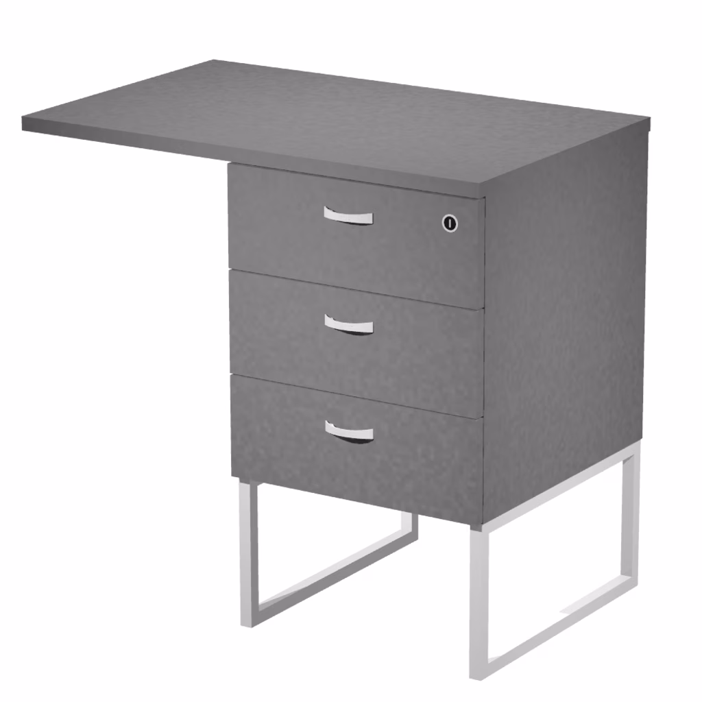 Cassettiera con gambe in metallo ad anello a sezione quadrata 20x20 mm (L47,5 H20,8 cm) verniciate a polvere epossidica complete di piedini regolabili in altezza al posto delle ruote. La cassettiera in questa configurazione misura L. 41,5 x P. 49,5 x H. 72,2 cm e può essere alloggiata anche sotto il desktop delle scrivanie. Disponibile anche nella versione con un top da 80x50 cm (sp. 22 mm) da posizionare sopra alla cassettiera su gambe metal. In questa configurazione la cassettiera, secondo la disposizione del top, che può essere montato con il lato di 80 cm sia parallelamente che perpendicolarmente rispetto al lato dei frontalini, misura L. 50 x P. 80 x H. 74,4 cm oppure L. 80 x P. 50 x H. 74,4. La cassettiera alta completa di top da 80x50 cm può essere affiancata e fissata alle scrivanie, così da realizzare un allungo laterale destro o sinistro. Colori struttura cassettiere: bianco / rovere chiaro / antracite. Colori gambe metal: antracite opaco 7016 oppure bianco opaco 9010.