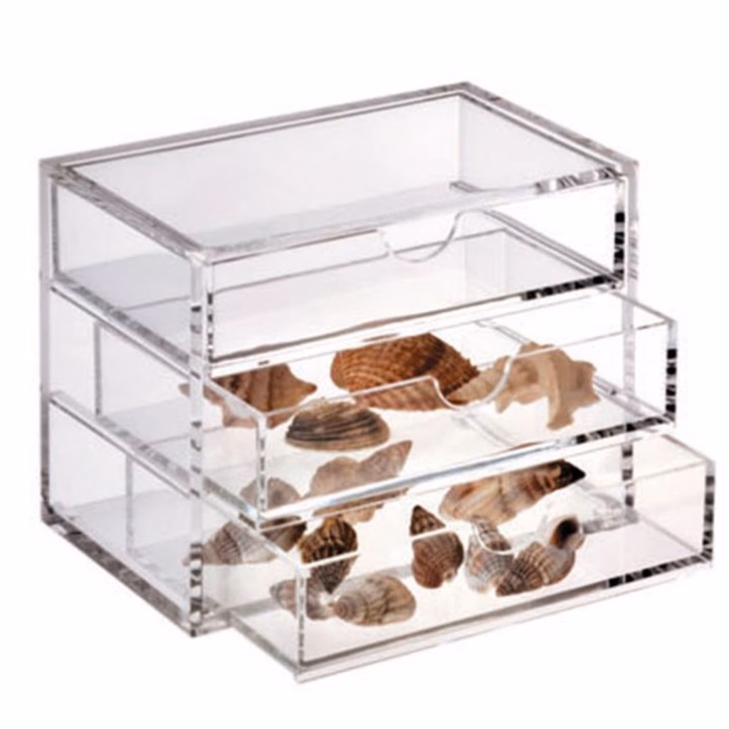 Cassettiera da banco realizzata in acrilico trasparente. Ideale per l'esposizione e l'organizzazione di piccoli oggetti, minuterie, articoli di gioielleria, piccola tecnologia, etc. presso negozi, bigiotterie, farmacie, ferramenta, centri estetici, parrucchieri, vetrine di negozi, uffici, per organizzare trucchi, prodotti di bellezza, gioielli, etc. Formato cm 12,2×8,9×9,7