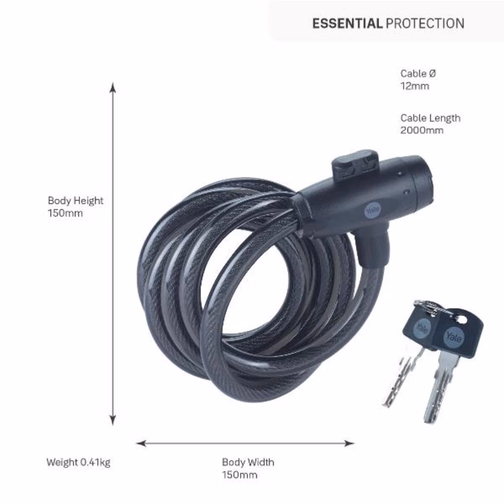 Il cavo di sicurezza per bici Essential di Yale con chiave di chiusura è la soluzione ideale in termini di efficienza e convenienza. È progettato per proteggere vecchie bici, ruote di scorta, barbecue, mobili da giardino o altri oggetti che conservi all'esterno.