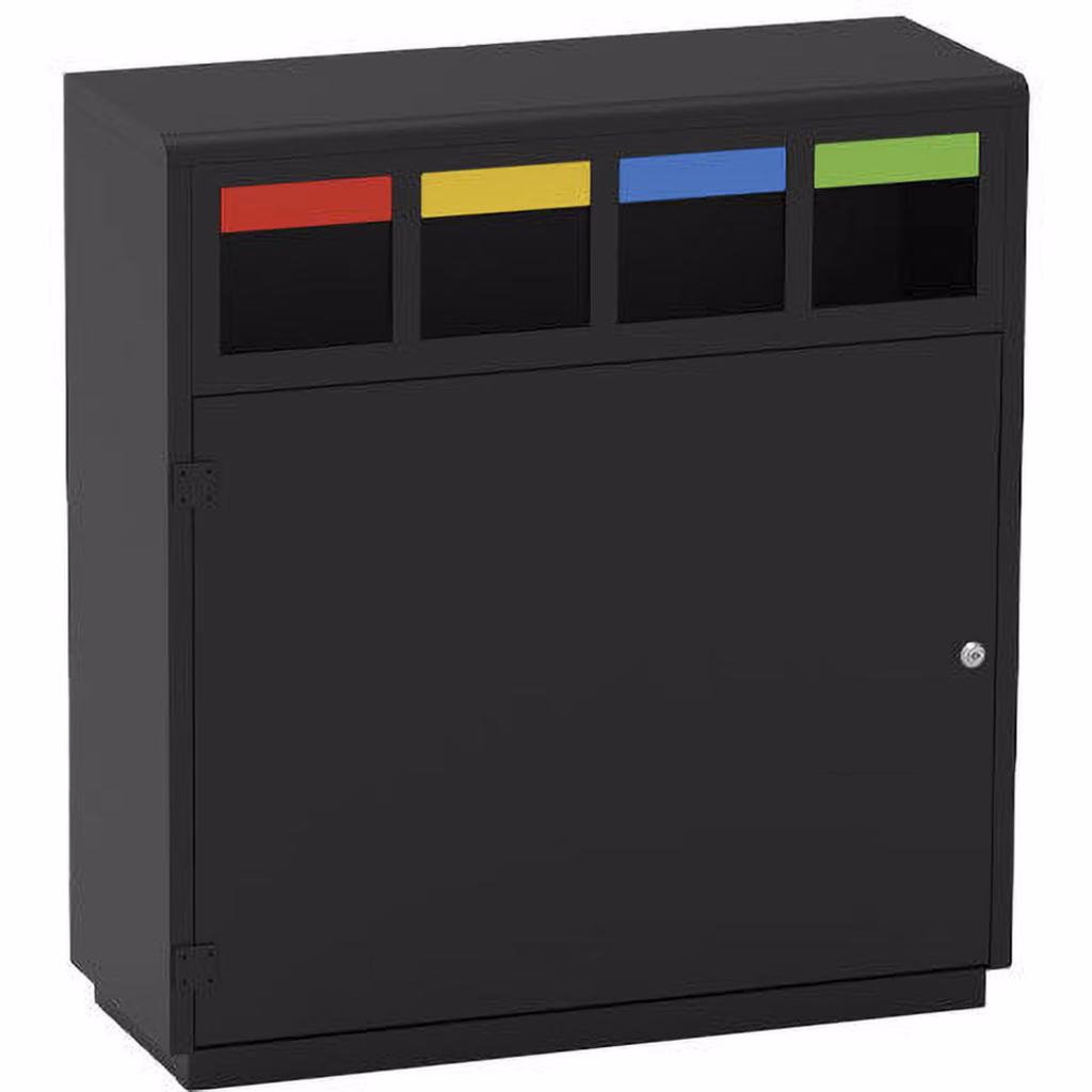 Struttura in acciaio zincato; verniciatura con polvere poliestere (RAL 7021); quattro aperture frontali di conferimento, con fasce colorate; ospita quattro supporti ferma-sacco in filo d'acciaio (4x40 litri); anta frontale con chiusura a chiave triangolare; in opzione, etichette pre-fustellate in vinile per la differenziata; zoccolo in Tubolare 50x50 con predisposizione per fissaggio a terra; ideale negli spazi pubblici di contesti urbani.