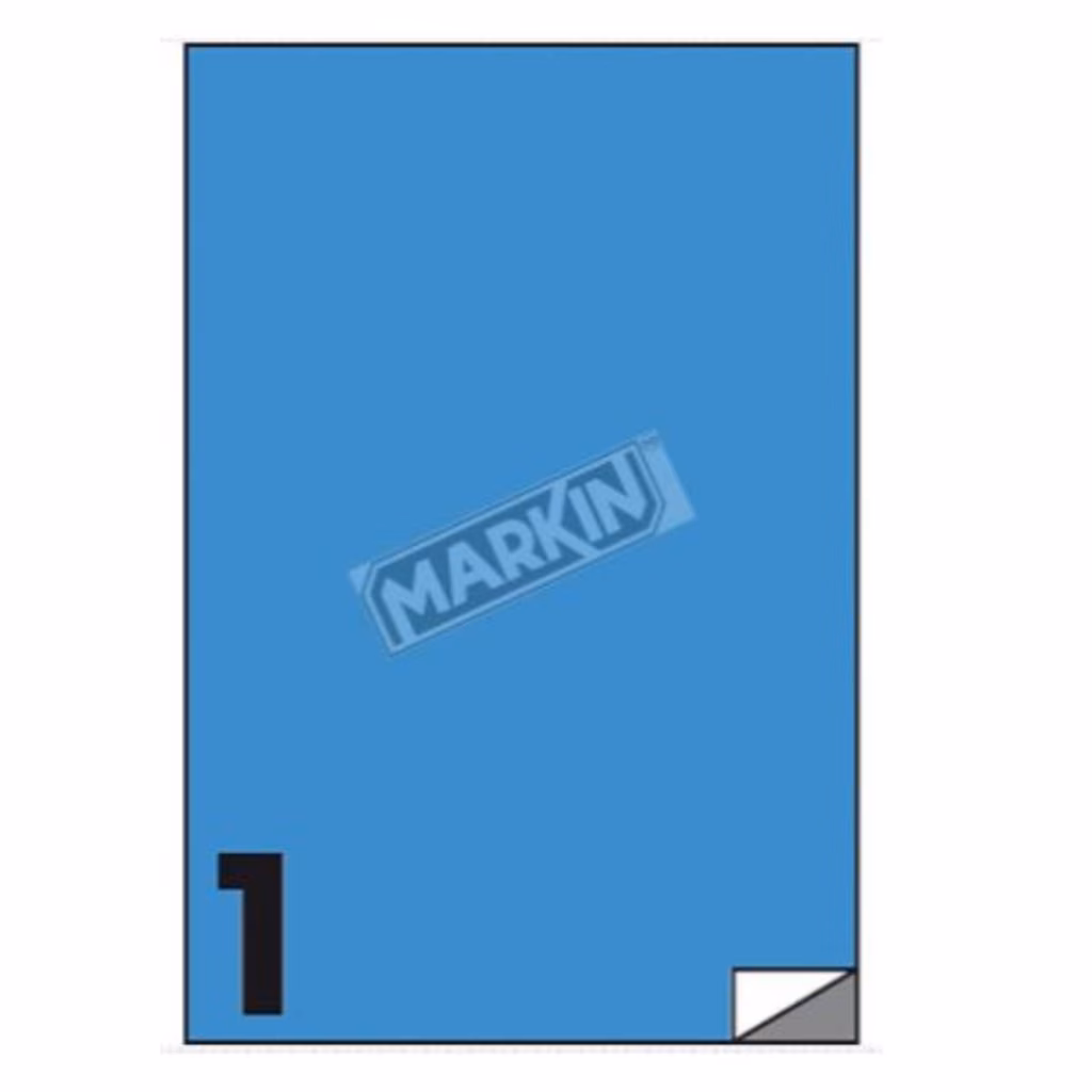 CARATTERISTICHEColore: bluMisure: 210x297 mmGrammatura: 80grFogli/Conf: 100Eti per conf: 100Eti per foglio: 1Adesivo: permanente