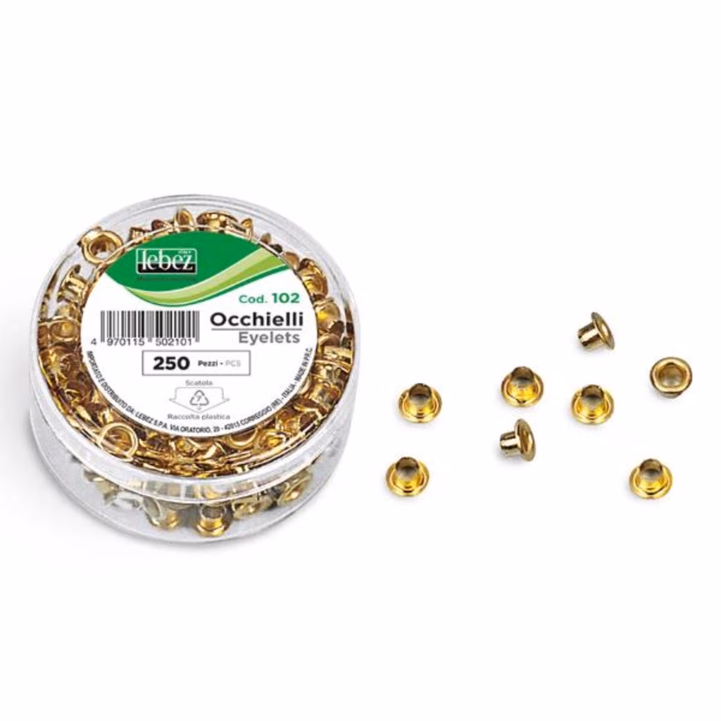 Occhielli in ottone ideali per rinforzare fori su documenti, cartoncini e supporti cartacei. Progettati per l'utilizzo con occhiellatrici compatibili, garantiscono una finitura resistente e ordinata.