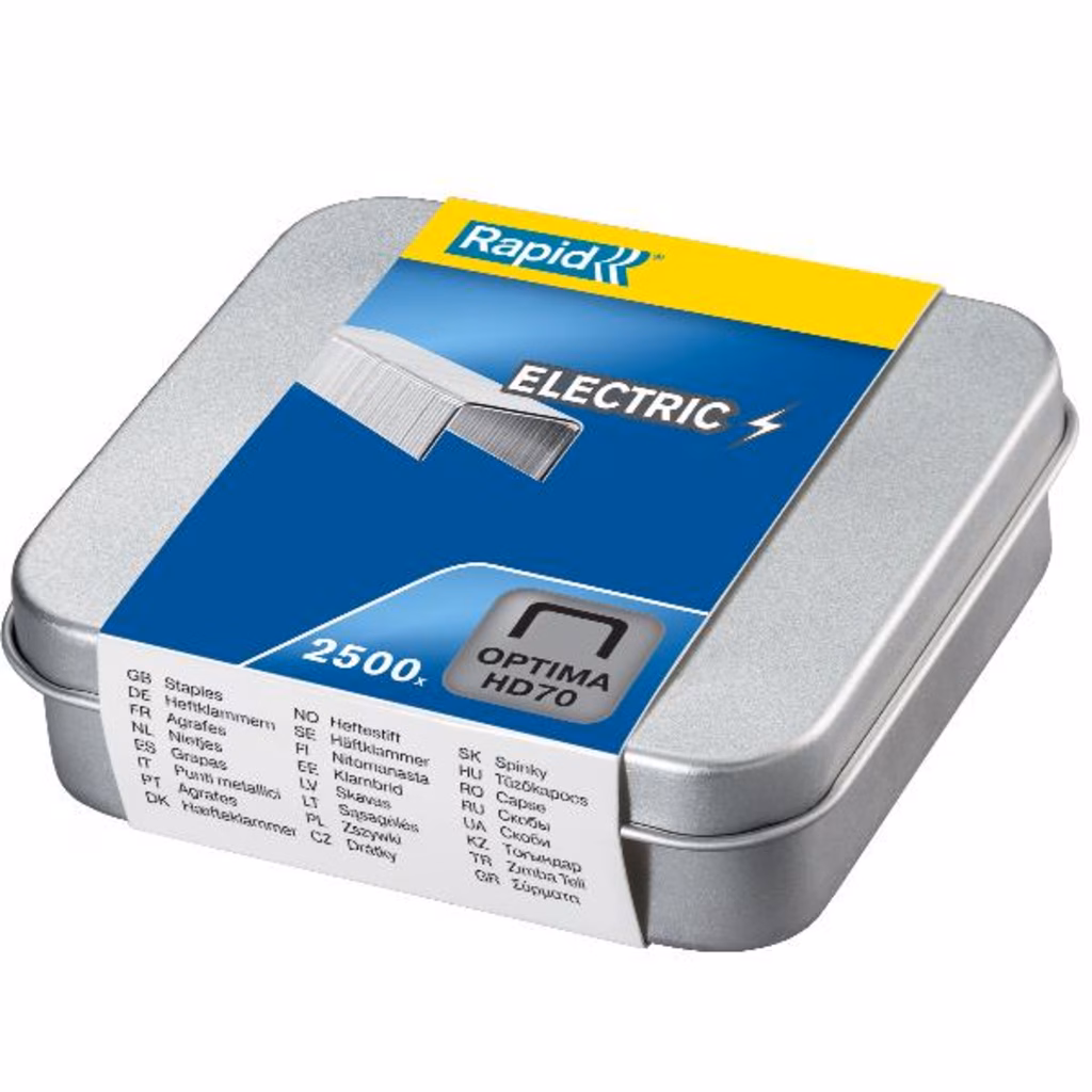Realizzati in acciaio di alta qualità con un'altezza maggiore e ultra appuntiti, i punti Optima HD70 penetrano facilmente fino a 70 fogli e garantiscono una cucitura senza inceppamenti se utilizzati con le cucitrici Rapid Electtriche Optima 45 e Opitma 70. Confezionati in una scatola di alluminio da 2500 punti con un coperchio sicuro.