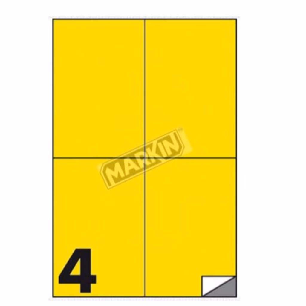 CARATTERISTICHEColore: gialloMisure: 105x148,5 mmGrammatura: 80grFogli/Conf: 100Eti per conf: 400Eti per foglio: 4Adesivo: permanente