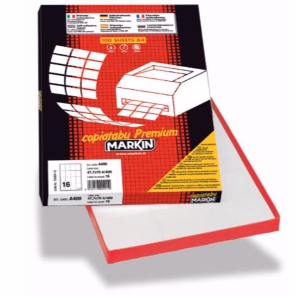 Scatola 100 fogli etichette gialle Copiatabu 105x148,5mm. Senza margine. In scatola da 100 fogli formato A4. Adesivo permanente universale, acrilico a base d'acqua. Ottima resistenza al calore. Buona adesione su cartoni e superfici non-polar. Buona adesione anche alle basse temperature -20°+100°C. Carta di pura cellulosa lisciata in macchina. Grammatura 80 g/m2 ISO 536. Stampabilità: INKJET, LASER e fotocopie, flexo, offset, tipo e serigrafia.