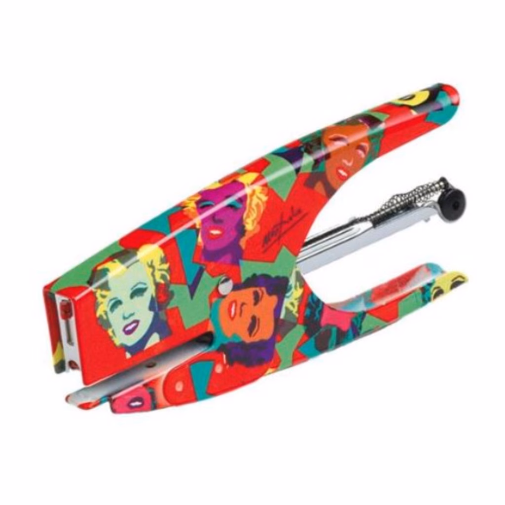 Cucitrici manuali a pinza passo 6, versione punto chiuso .Realizzate interamente in acciaio cromato e rivestite con una particolare tecnica di finitura.Preziose, divertenti, coloratissime con i loro evidenti richiami alla Pop Art, le cinque cucitrici della nuova Pop Office Collection sono firmate da Ugo Nespolo, uno dei più grandi artisti italiani contemporanei.