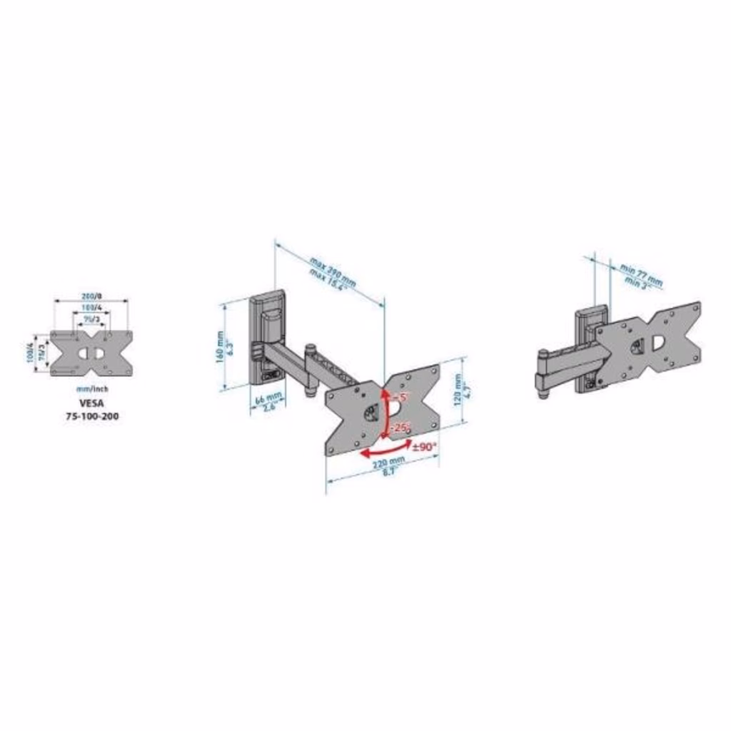 CME è la linea di supporti economici pensata per chi cerca la qualità Meliconi a prezzi accessibili. Il modello EDR120 è un supporto per TV a muro compatibile con tutte le TV dotate di foratura VESA 75-100-200×100 mm. Grazie al braccio estensibile, permette di allontanare la TV dalla parete e di regolarla con precisione grazie alla possibilità di inclinazione verticale e orizzontale fino a 90° (dipende dalle dimensioni della TV).