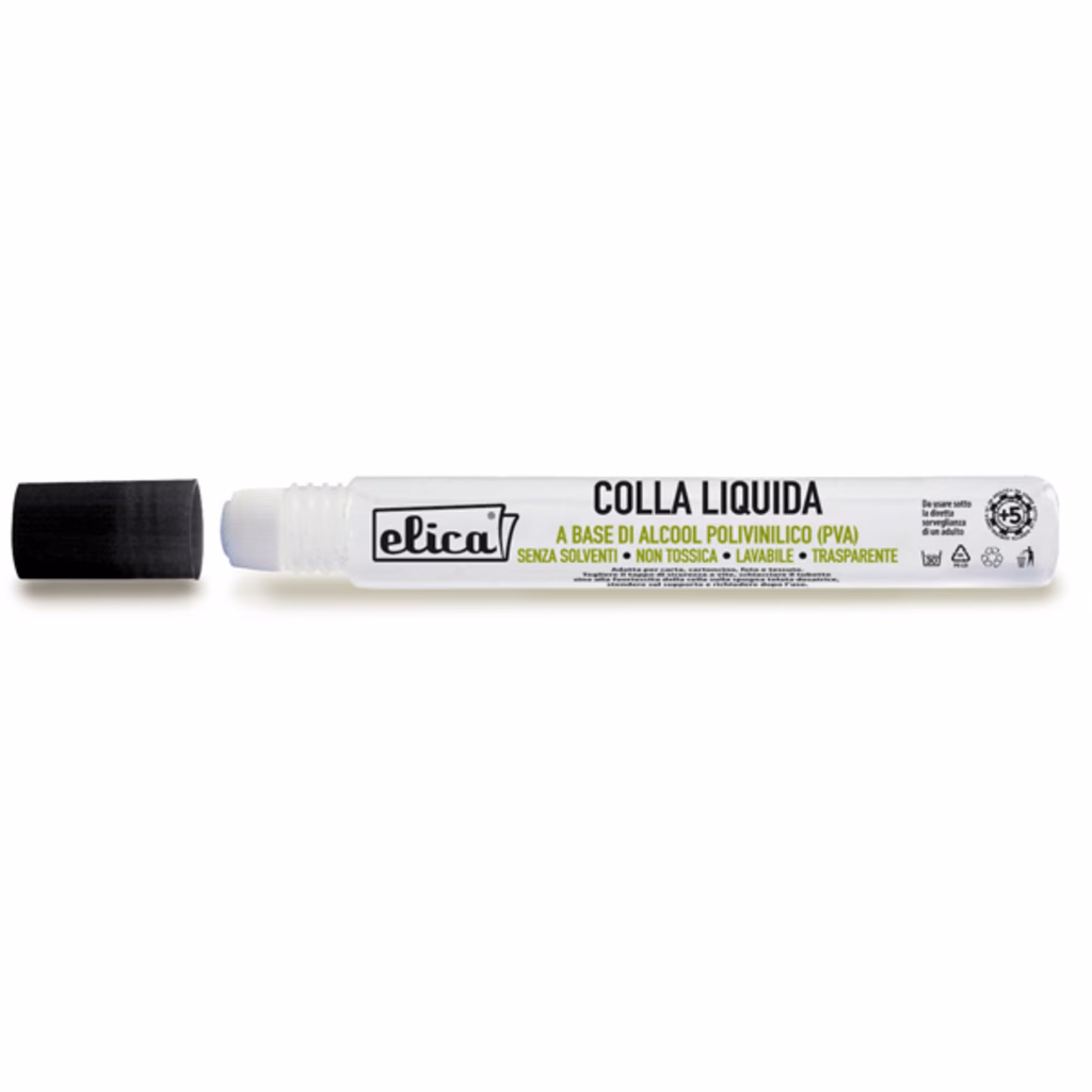 Colla liquida trasparente a base di alcool polivinilico (PVA), senza solventi, non tossica, lavabile - punta con spugna telata dosatrice da usare come una penna - flacone in plastica con tappo a vite - tappetto di sicurezza sotto l'erogatore da togliere prima dell'uso - Gli imballaggi utilizzati per proteggere questo prodotto sono stati realizzati senza l'utilizzo di materiali plastici, contribuendo a ridurre l'inquinamento da plastiche e le emissioni in atmosfera di CO2 e limitando l'ulteriore sviluppo dell'effetto serra