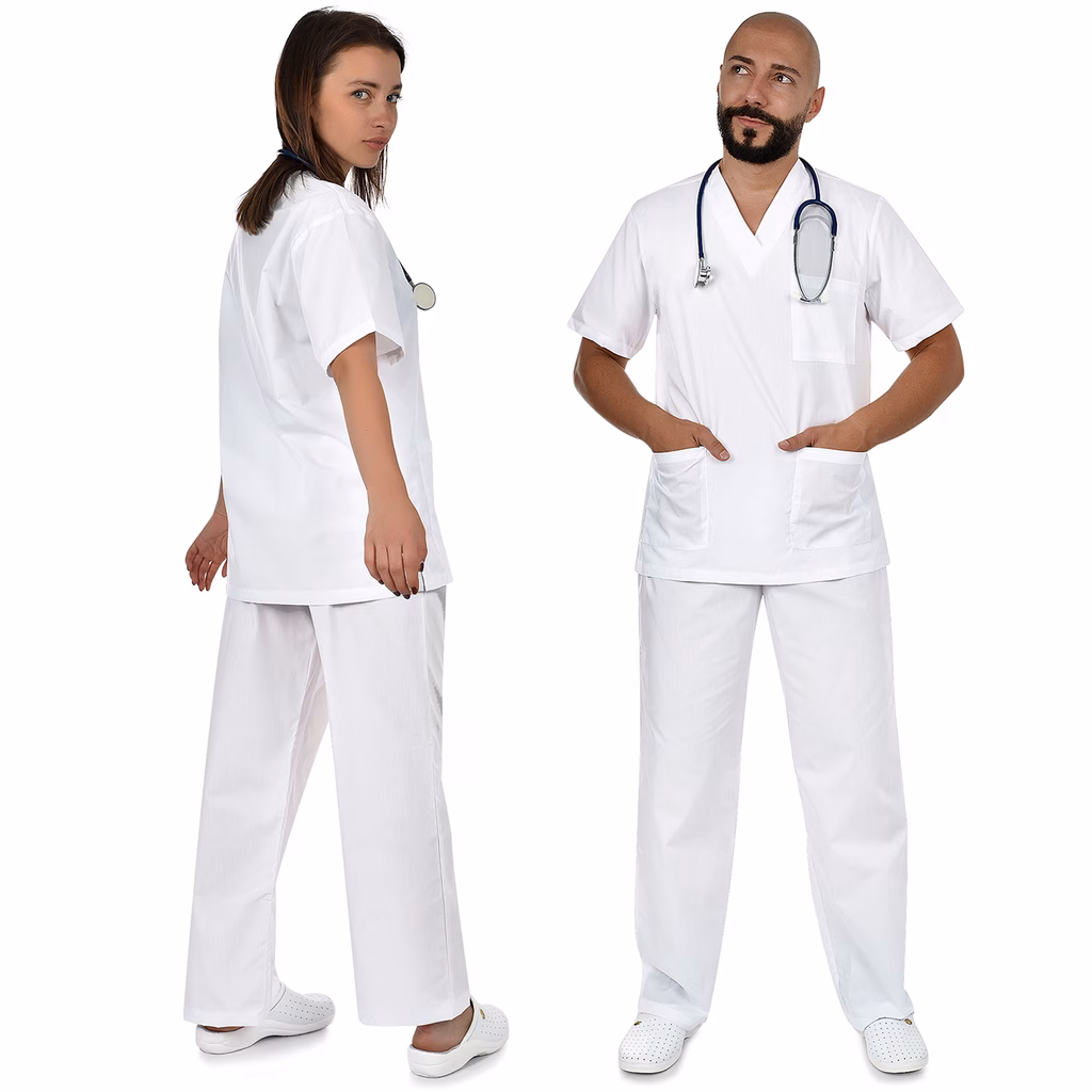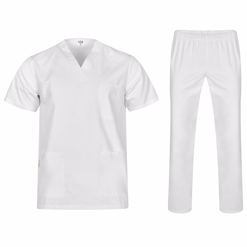 Completo unisex taglio confortevole. Casacca con mezza manica collo a V tre tasche. Pantalone con elastico in vita e tasca posteriore. Composizione tessuto: 65% poliestere - 35% cotone