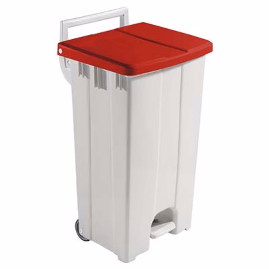Contenitore per raccolta differenziata realizzato interamente in polipropilene bianco. Il coperchio a pedale è colorato in base all'utilizzo. Conforme alle norme HACCP. Dotato di maniglia ergonomica, di coperchio per evitare la fuoriuscita di sgradevoli odori e di pedale per consentirne l'apertura senza l'ausilio delle mani. Ruote grigie in gomma antitraccia da mm 100 di diametro. Personalizzabile con una vasta gamma di accessori funzionali.