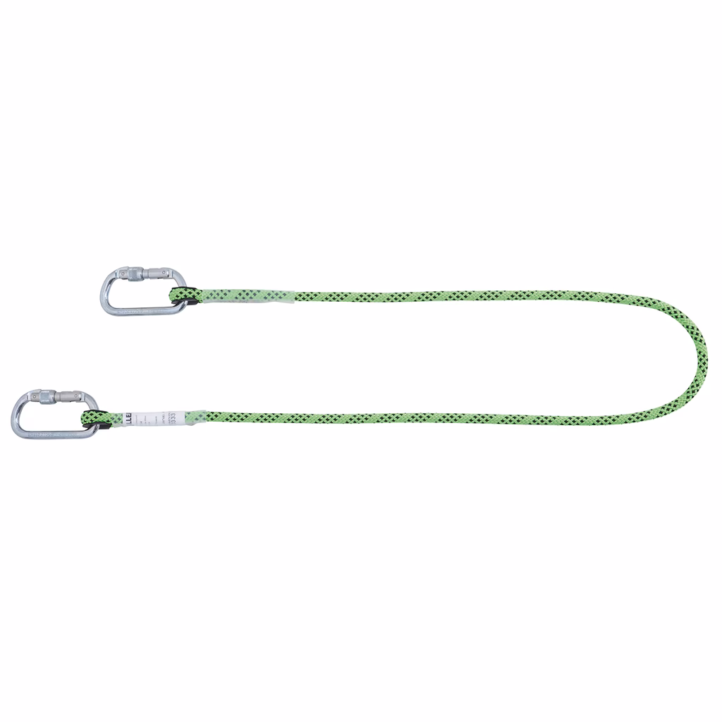 Cordino trattenuta testato su spigolo con 2 moschettoni da 17 mm - Materiali: corda kernmantle diametro 11mm - Calza: poliestere - Anima: poliammide - Cordino: Carico di rottura della corda: >22kN - Temperatura: da -30°C a +50°C EN 354 EN 358 : 1999