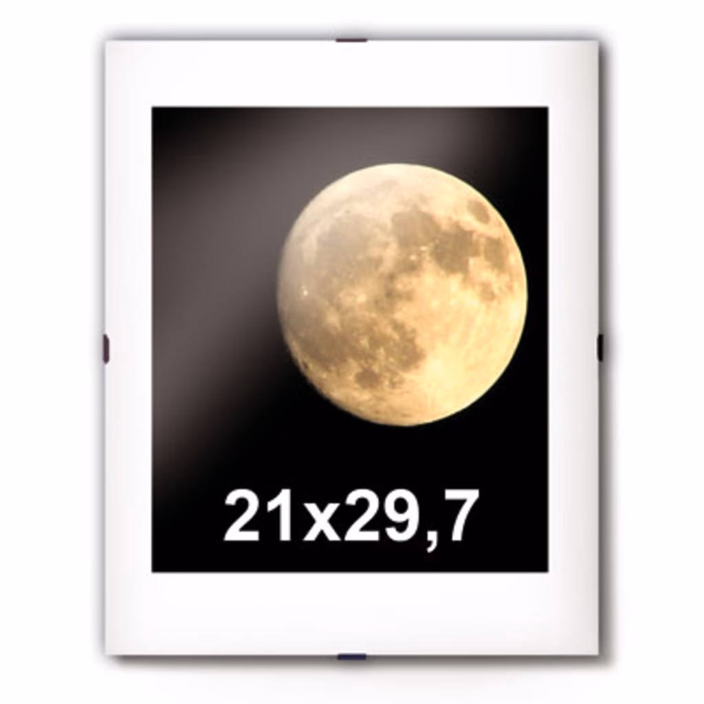 Cornice a giorno in Crilex da 0,7mm alta trasparenza con trattamento anti-ingiallimento - ultra resistente e più leggera rispetto alle cornici in vetro - supporto in MDF (pannello di fibra legnosa a media densità) certificato FSC® - fermagli antiruggine
