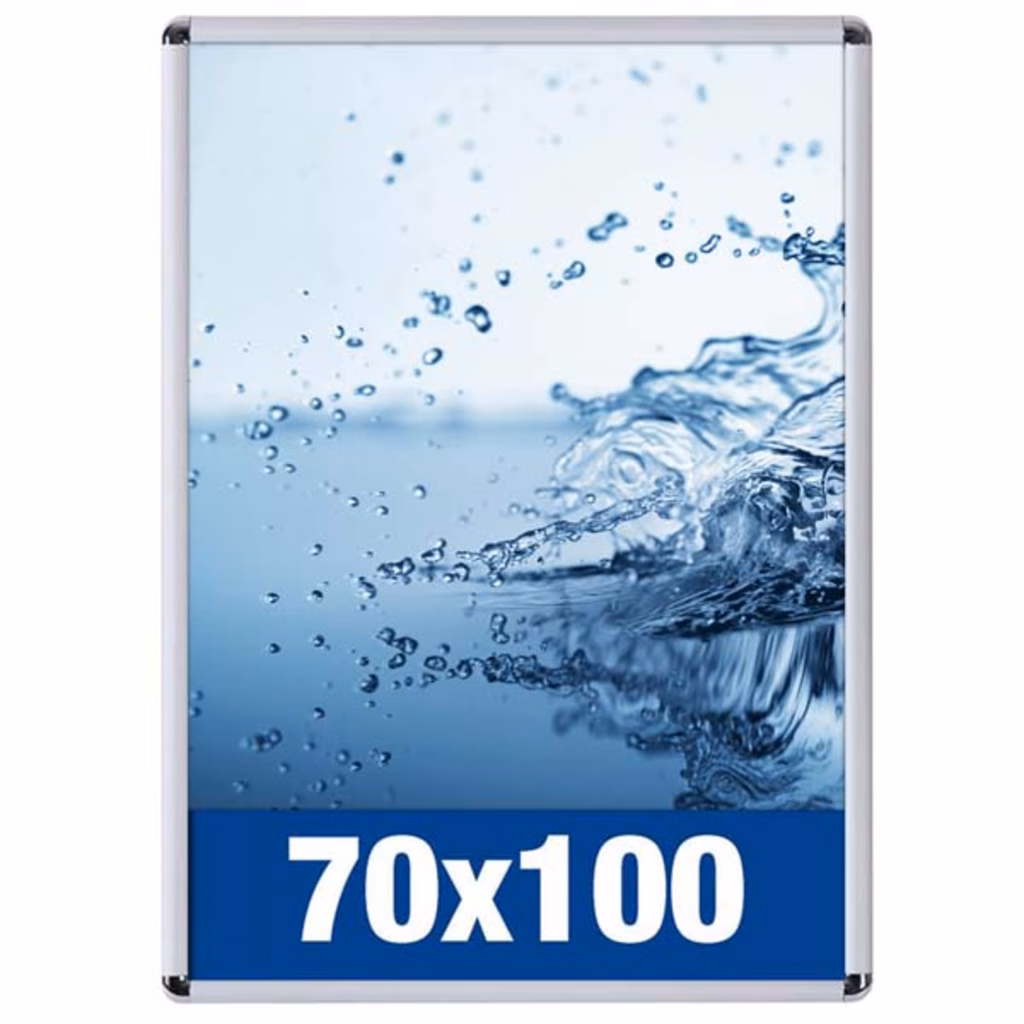 Cornice a scatto in alluminio anodizzato con profilo curvo mm 25, angolo tondo - fondo in materiale plastico PS e completa di protezione in PVC antiriflesso - orientamento della cornice verticale e orizzontale