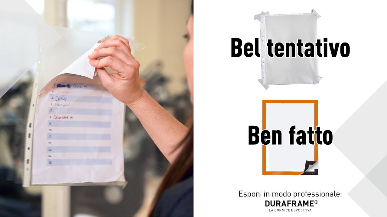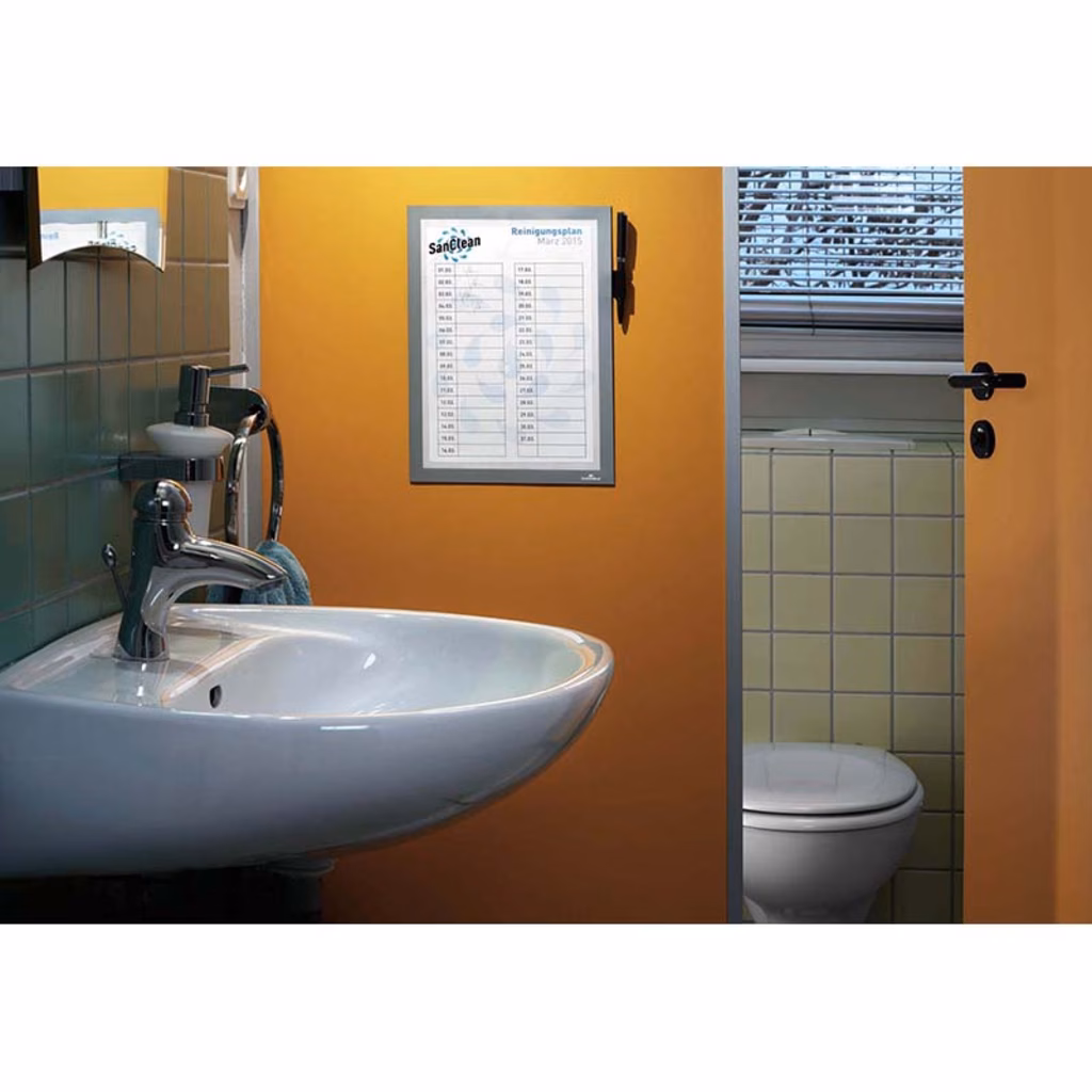 Cornice adesiva rimovibile formato A4 con pannello ad apertura/chiusura magnetica. Il pannello frontale è dotato di una finestra aperta ideale per poter scrivere direttamente sull'inserto presente nella cornice. È la soluzione ideale per esporre professionalmente avvisi, elenchi, programmi di pulizia e qualsiasi documentazione che necessità di essere compilata. Sul lato della cornice è presente un portapenne a clip utile per tenere le penne sempre a portata di mano. L'inserto è facilmente sostituibile semplicemente sollevando il pannello magnetico e inserendo il nuovo documento. Applicabile su qualsiasi superficie liscia e solida; il retro è adesivo e riposizionabile numerose volte senza lasciare residui. Utilizzabile in senso orizzontale e verticale.