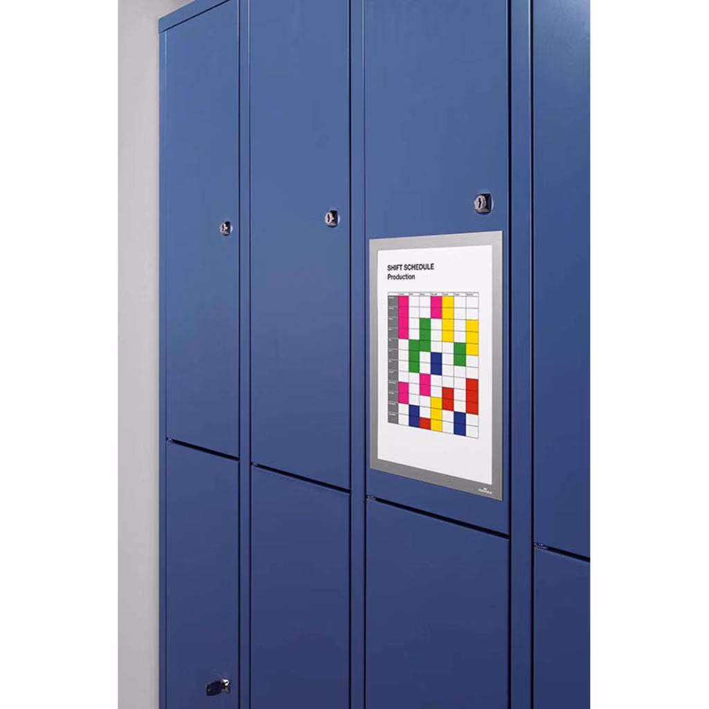 Cornice espositiva formato utile A4 a fissaggio magnetico, con pannello frontale trasparente antiriflesso. Permette di esporre documenti e avvisi su qualsiasi superficie metallica in modo elegante e professionale. L'inserto è facilmente sostituibile sollevando e riposizionando la cornice. È l'ideale in ambienti di lavoro quali officine, magazzini, cantieri ed anche su lavagne e bacheche magnetiche. Utilizzabile in senso orizzontale oppure verticale.