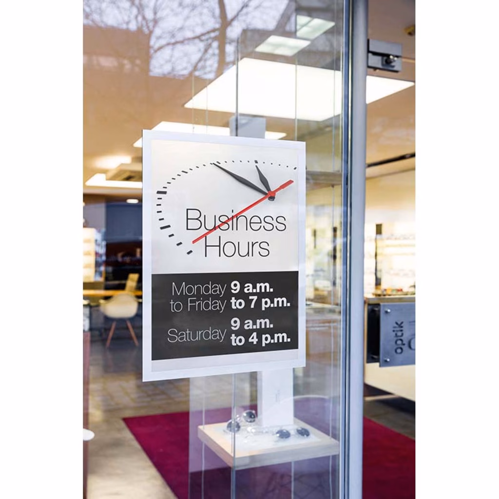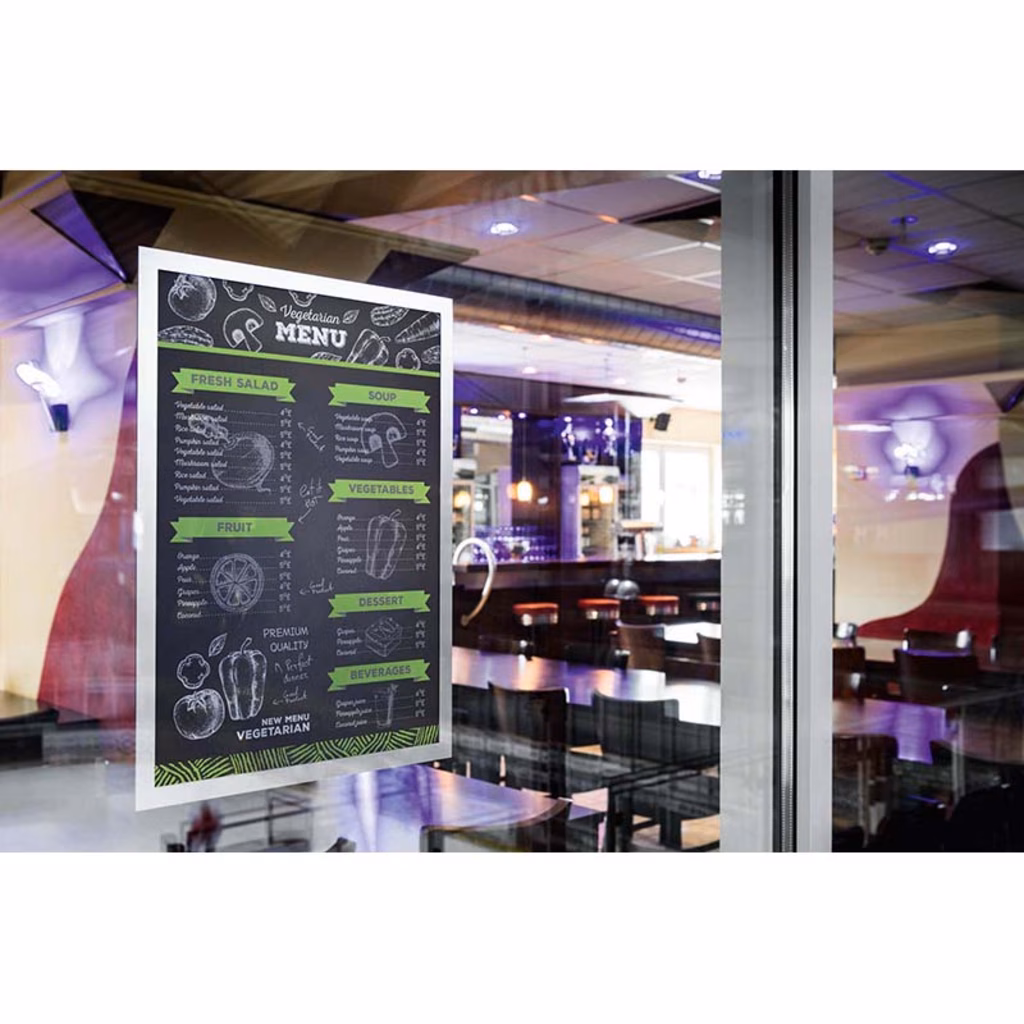 Cornice espositiva per superfici vetrate esposte al sole. Antiriflesso, resistente al calore fino a 70°C ed ai raggi UV fino a 2 anni. Ideale per le vetrine di attività commerciali, cristalli parabrezza e finestrini delle automobili. Aderisce senza adesivo applicandola dall'interno della vetrata, è rimovibile e riposizionabile senza lasciare residui. Inoltre la cornice è identica su entrambi i lati e permette una perfetta visualizzazione sia all'esterno che all'interno. L'inserto è facilmente sostituibile semplicemente sollevando il pannello magnetico. Può essere usata in posizione verticale e orizzontale.