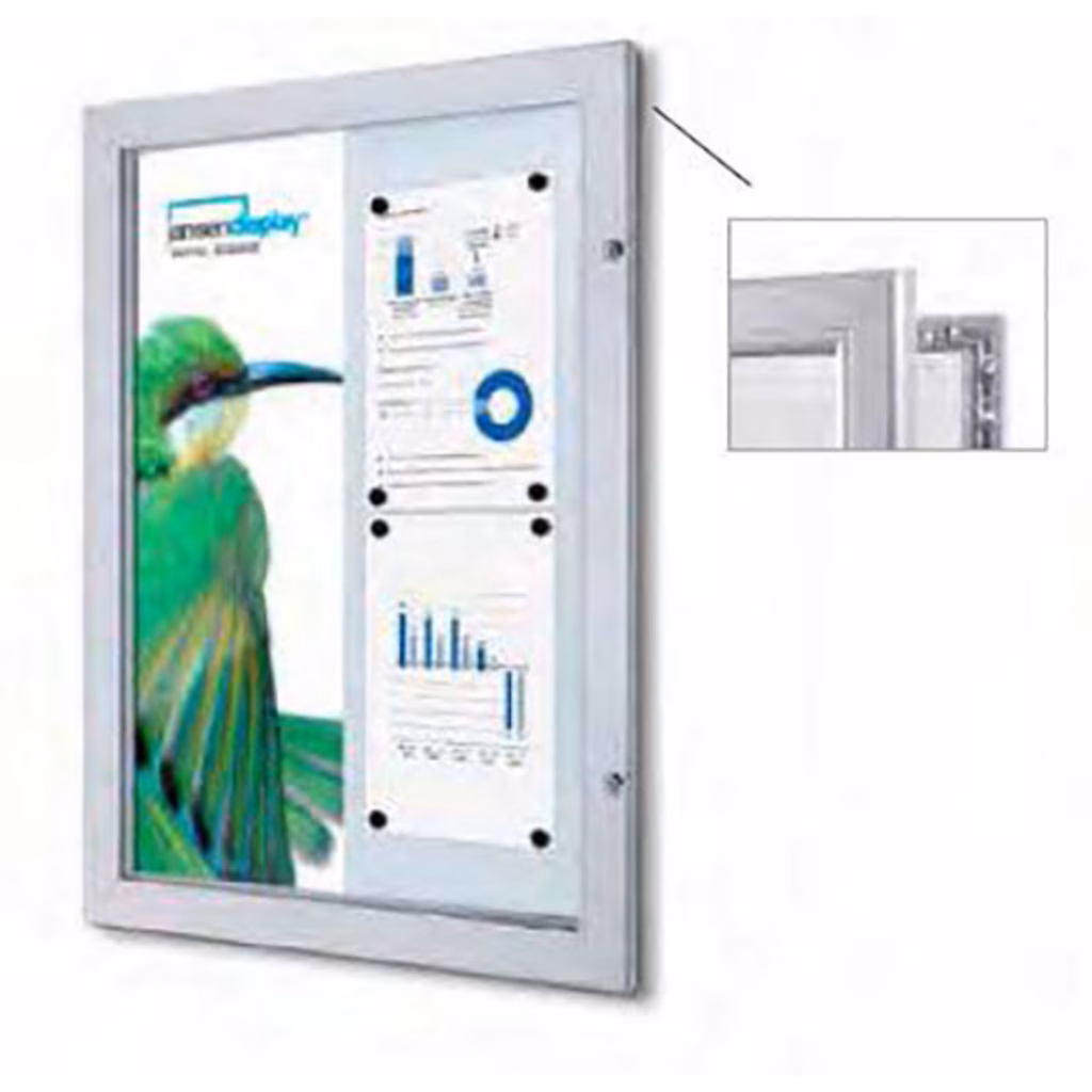 Cornice per poster con doppia serratura JANSEN DISPLAY cm 70x100 - profilo mm 53 - pannello frontale PETG mm 3 e pannello posteriore in metallo - ventilazione migliorata per eliminare la condensa - spazio interno aumentato - migliorata la prevenzione per l'ingresso d'acqua - guarnizione in gomma nell'entrata frontale e nel pannello posteriore - meccanismo che tiene fermo il poster facile da utilizzare - profilo con apertura magnetica