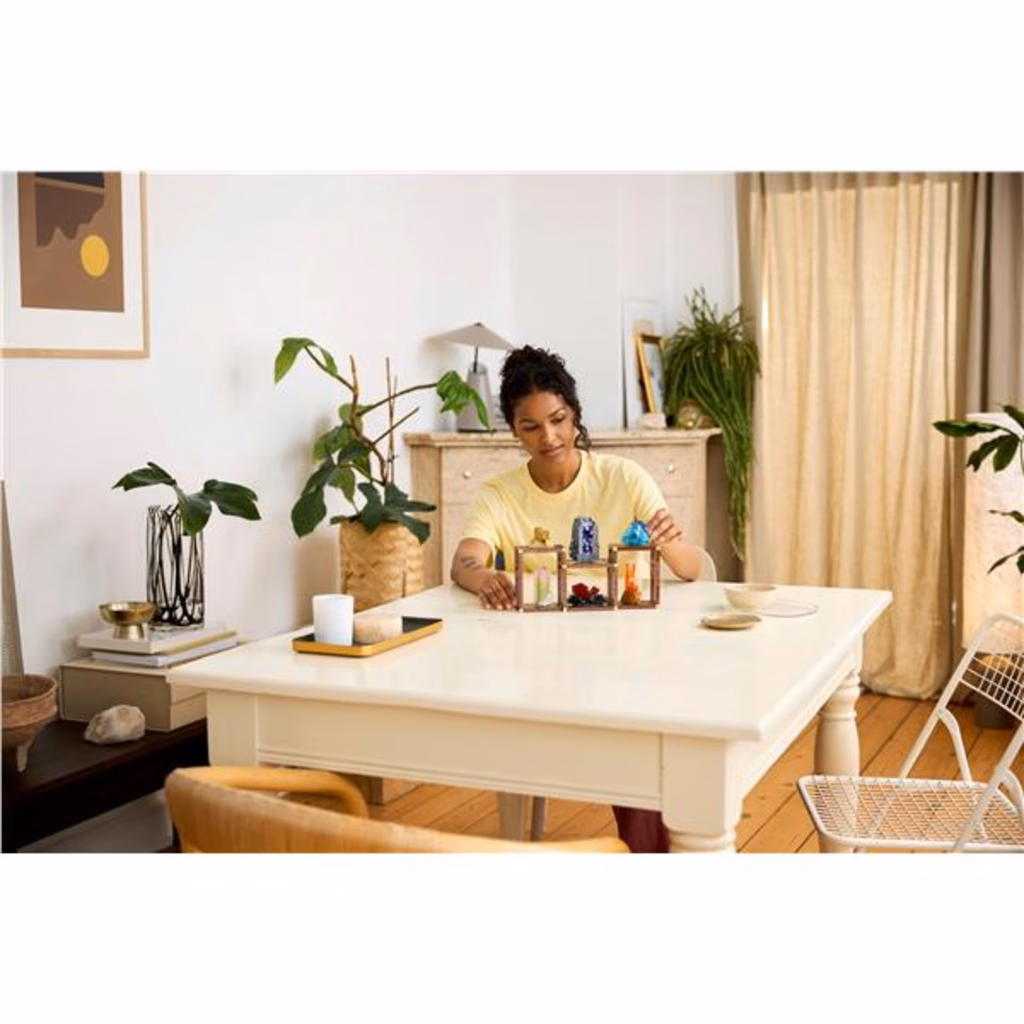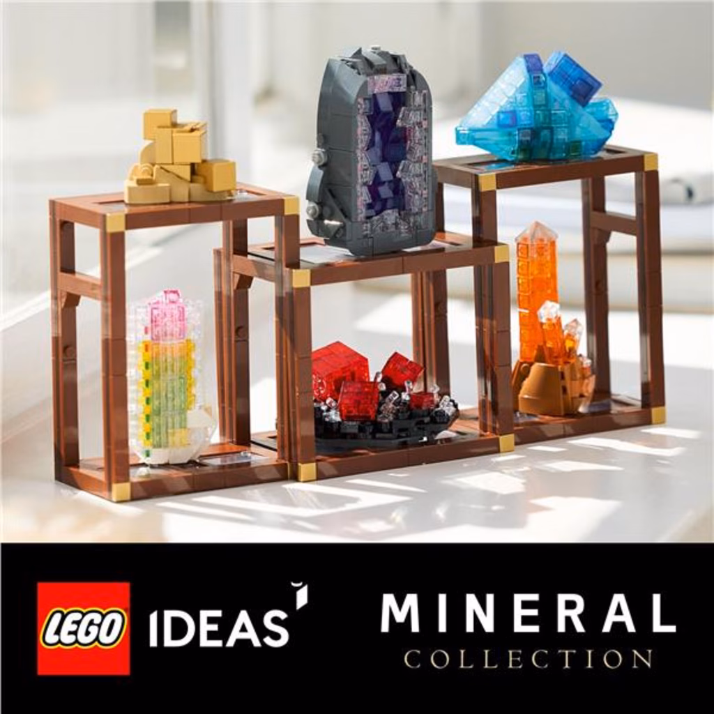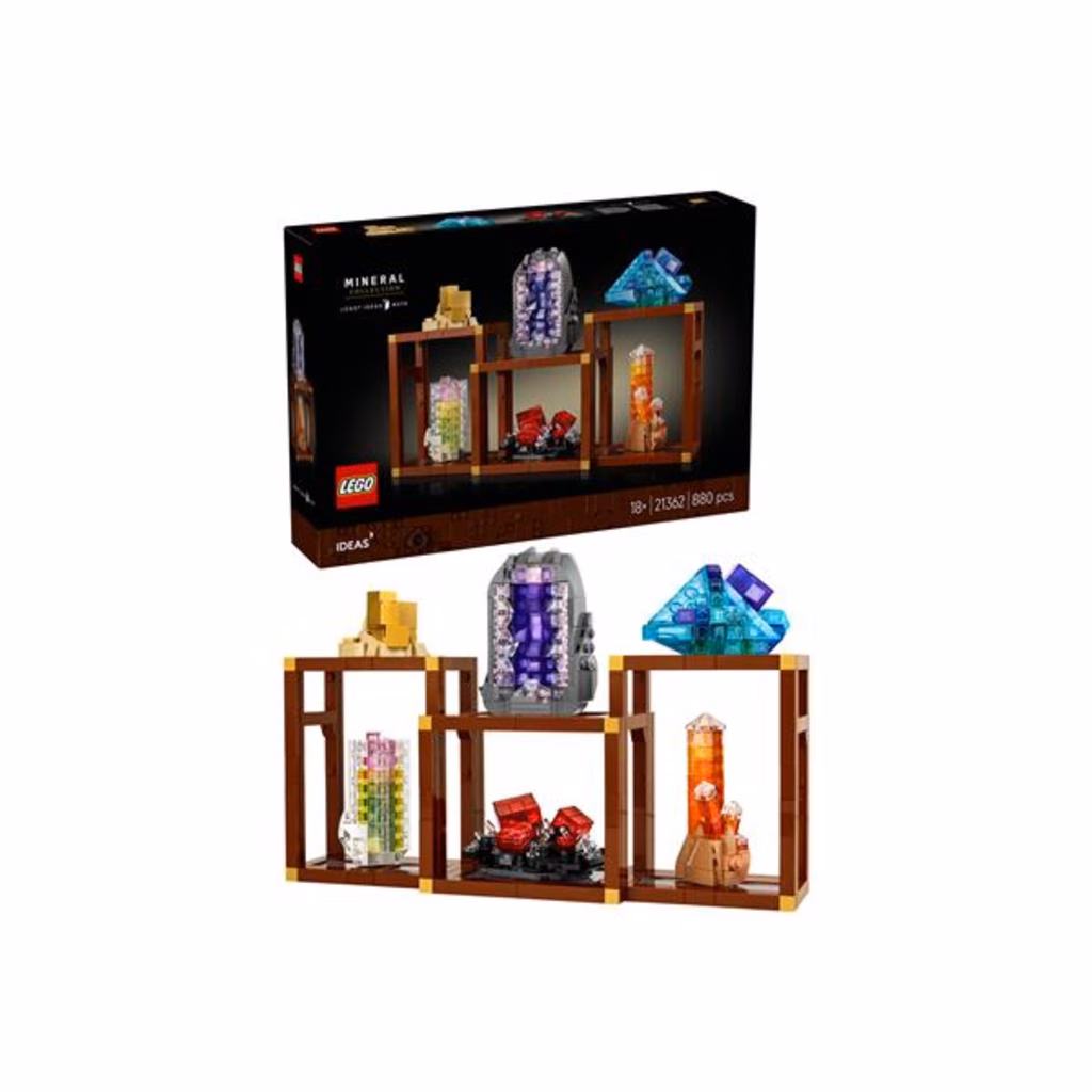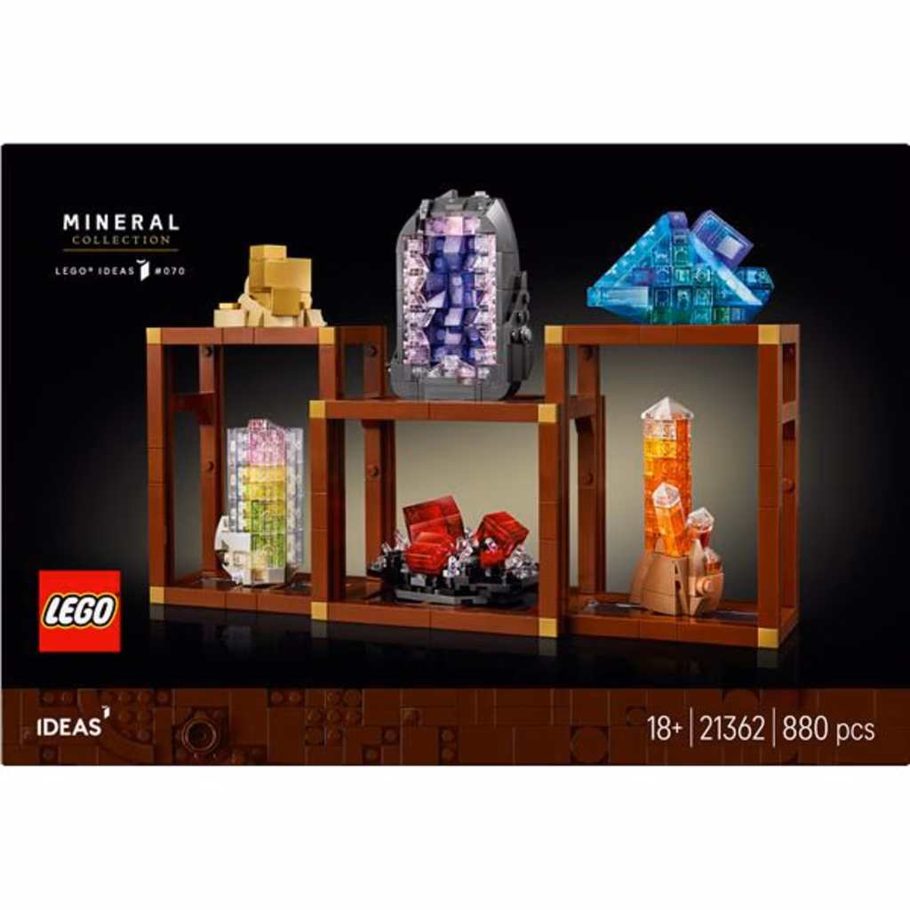 Mostra i colori vivaci dei minerali con il set da costruzione Collezione di minerali LEGO® Ideas (21362) per adulti. Un regalo meraviglioso per i collezionisti di rocce e gli amanti della natura, questo set presenta modelli in mattoncini di 6 minerali e scaffali da esposizione costruibili per creare una accattivante decorazione per il soggiorno.Utilizzando tecniche di costruzione intelligenti e mattoncini LEGO trasparenti, è possibile creare modelli di pirite dorata, ametista viola, fluorite blu, tormalina rossa, rodocrosite rosata e quarzo arancione. Assembla i 3 scaffali e fissa le tue creazioni ai ripiani. Disponi le unità a tuo piacimento e cambia i minerali su ripiani per variare la tua esposizione.Trova le istruzioni per la costruzione in questo kit modello per adulti o goditi un esperienza di costruzione intuitiva con l app LEGO Builder, dove potrai visualizzare una versione digitale 3D del tuo modello mentre lo costruisci. Il set contiene 880 pezzi.